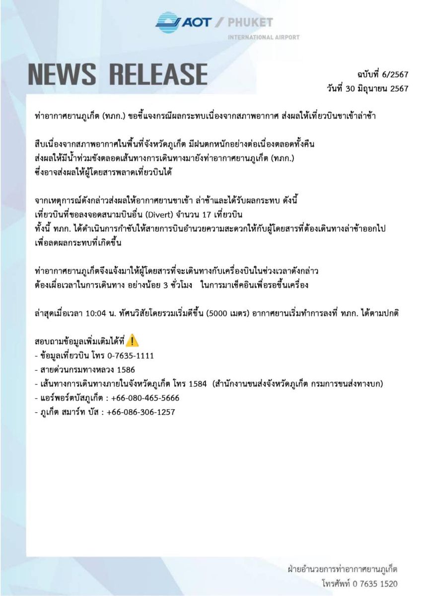 ท่าอากาศยานภูเก็ต (ทภก.) ขอชี้แจงกรณีผลกระทบเนื่องจากสภาพอากาศ ส่งผลให้เที่ยวบินขาเข้าล่าช้า สืบเนื่องจากสภาพอากาศในพื้นที่จังหวัดภูเก็ต มีฝนตกหนักอย่างต่อเนื่องตลอดทั้งคืน ส่งผลให้มีน้ำท่วมขังตลอดเส้นทางการเดินทางมายังท่าอากาศยานภูเก็ต (ทภก.) ซึ่งอาจส่งผลให้ผู้โดยสารพลาดเที่ยวบินได้ จากเหตุการณ์ดังกล่าวส่งผลให้อากาศยานขาเข้า ล่าช้าและได้รับผลกระทบ ดังนี้ เที่ยวบินที่ขอลงจอดสนามบินอื่น (Divert) จำนวน 17 เที่ยวบิน ทั้งนี้ ทภก. ได้ดำเนินการกำชับให้สายการบินอำนวยความสะดวกให้กับผู้โดยสารที่ต้องเดินทางล่าช้าออกไป เพื่อลดผลกระทบที่เกิดขึ้น ท่าอากาศยานภูเก็ตจึงแจ้งมาให้ผู้โดยสารที่จะเดินทางกับเครื่องบินในช่วงเวลาดังกล่าว ต้องเผื่อเวลาในการเดินทาง อย่างน้อย 3 ชั่วโมง ในการมาเช็คอินเพื่อรอขึ้นเครื่อง ล่าสุดเมื่อเวลา 10:04 น. ทัศนวิสัยโดยรวมเริ่มดีขึ้น (5000 เมตร) อากาศยานเริ่มทำการลงที่ ทภก. ได้ตามปกติ
