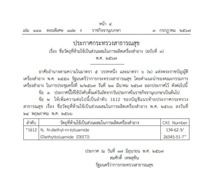 ข้อ 2 ให้เพิ่มความต่อไปนี้เป็นลำดับ 1612 ของบัญชีแนบท้ายประกาศกระทรวงสาธารณสุข เรื่อง ชื่อวัตถุที่ห้ามใช้เป็นส่วนผสมในการผลิตเครื่องสำอาง พ.ศ. 2566 ลงวันที่ 24 พฤษภาคม พ.ศ. 2566 ลำดับ วัตถุที่ห้ามใช้เป็นส่วนผสมในการผลิตเครื่องสำอาง CAS Number ”1612 N, N-diethyl-m-toluamide 134-62-3/(Diethyltoluamide (DEET) 26545-51-7″