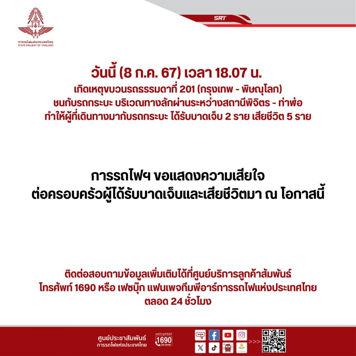 นายเอกรัช ศรีอาระยันพงษ์ หัวหน้าสำนักงานผู้ว่าการ การรถไฟแห่งประเทศไทย เปิดเผยว่า วันนี้ (8 กรกฎาคม 2567) เวลา 18.07 น. การรถไฟฯ ได้รับรายงาน เหตุขบวนรถธรรมดาที่ 201 กรุงเทพ- พิษณุโลก ชนกับรถกระบะ ยี่ห้อนิสสัน สีน้ำตาล หมายเลขทะเบียน จังหวัดพิจิตร บริเวณทางลักผ่าน หลักกิโลเมตรที่ 349/17 - 350/1 ระหว่างสถานีพิจิตร - ท่าฬ่อ อำเภอเมือง จังหวัดพิจิตร ซึ่งบริเวณดังกล่าวมีป้ายเตือนและสัญญาณไฟครบถ้วน จากเหตุการณ์ดังกล่าวส่งผลให้มีผู้ได้รับบาดเจ็บ 2 ราย และผู้เสียชีวิต 5 ราย
