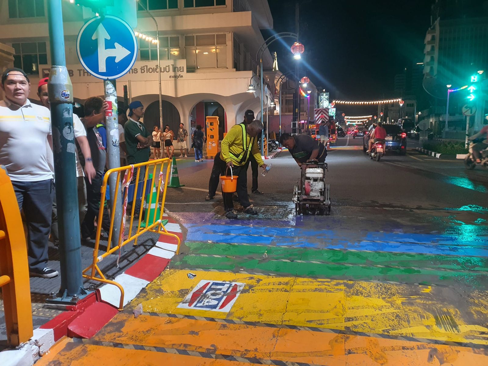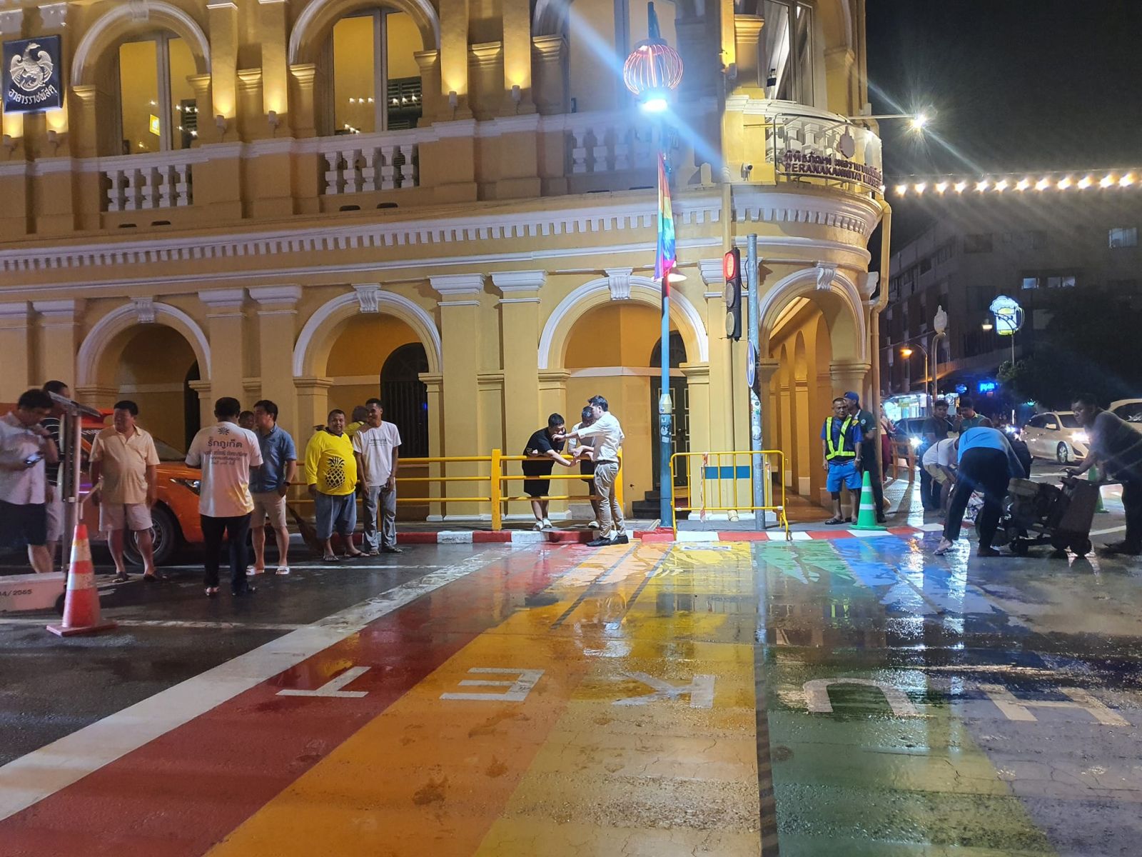 ลบออกแล้ว! "ทางม้าลายสีรุ้ง" แยกชาร์เตอร์ด แลนด์มาร์กสุดฮิตภูเก็ต หลังจักรยานยนต์ลื่นล้มช่วงฝนตกเจ็บหลายราย
