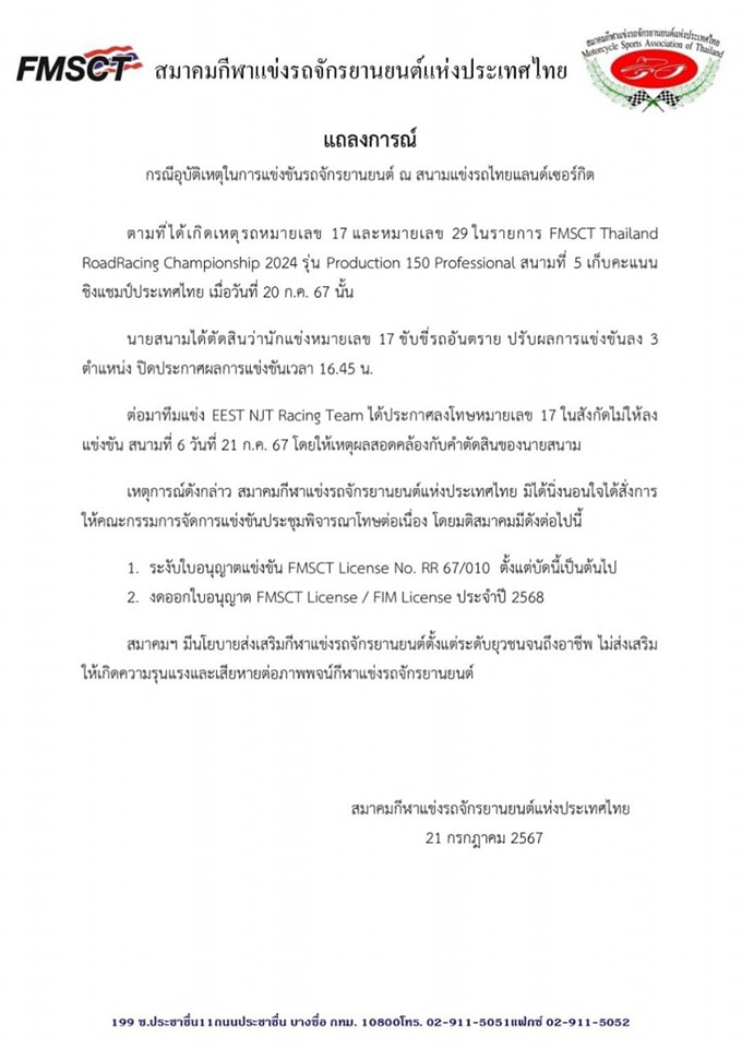 ตามที่ได้เกิดเหตุ รถหมายเลข 17 และหมายเลข 29 ในรายการ FMSCT Thailand RoadRacing Championship 2024 5'u Production 150 Professional สนามที่ 5 เก็บคะแนนชิงแชมป์ประเทศไทย เมื่อวันที่ 20 ก.ค. 67 นั้น