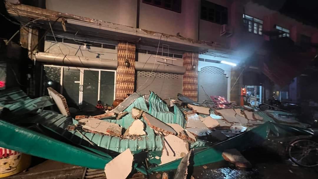 ลมพายุพัดเมืองตราด อาคารพาณิชย์กันสาดพัง ทับรถจักรยานยนต์จมใต้ซากพังเสียหาย โชคดีไร้คนเจ็บ กู้ภัยเร่งอพยพชาวบ้าน-คนป่วยฉุกเฉิน