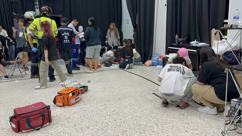 เมื่อเดินทางไปถึง บริเวณตึกที่ 9 บริเวณชั้น 1 ลักษณะเป็นห้องกระจกโล่ง ภายในห้องพบนักศึกษาทั้งชายและหญิง นอนเป็นลมหมดสติอยู่ประมาณกว่า 10 คน จึงประสานขอรถกู้ชีพ อาสาสมัครป่อเต็กตึ๊งที่อยู่ใกล้เคียงเข้าช่วยเหลือ พร้อมทีมพยาบาลปฐมพยาบาลเบื้องต้น และลำเลียงผู้ป่วยส่งโรงพยาบาลใกล้เคียง