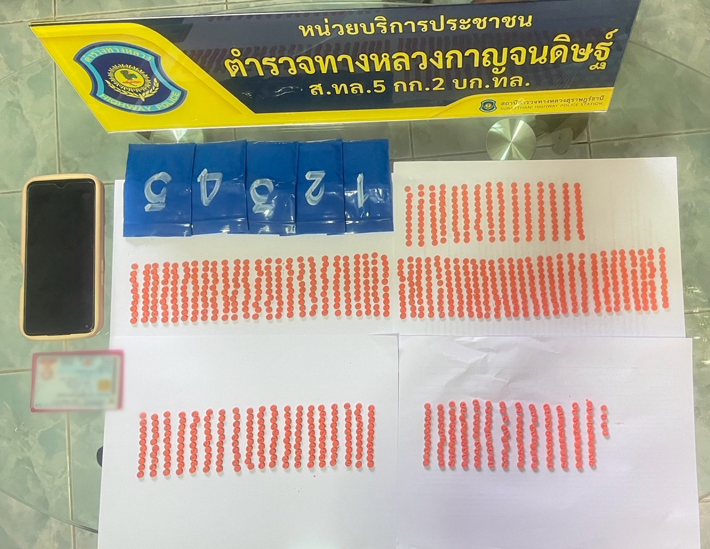 สืบเนื่องจาก พ.ต.ต.ปานเทพ พจน์ธีระมนตรี สว.ส.ทล.5 กก.2 บก.ทล. ได้สั่งการให้เจ้าหน้าที่ตำรวจหน่วยบริการประชาชนตำรวจทางหลวงกาญจนดิษฐ์ ออกตรวจในเขตพื้นที่รับผิดชอบ เพื่อป้องกันและปราบปรามอาชญากรรมที่อาจจะเกิดขึ้นบนท้องถนน จากการออกตรวจพื้นที่รับผิดชอบ ต.วัดประดู่ อ.เมืองสุราษฎร์ธานี จ.สุราษฎร์ธานี เจ้าหน้าที่ตำรวจได้ตรวจพบรถจักรยานยนต์ ยี่ห้อฮอนด้า สีดำ ป้ายทะเบียน สุราษฎร์ธานี ขับอยู่บริเวณไหล่ทางด้านซ้าย มีลักษณะมีพิรุธต้องสงสัยว่าจะมีสิ่งของผิดกฎหมาย เจ้าหน้าที่ชุดจับกุมจึงได้ส่งสัญญานให้ผู้ขับขี่จอดรถและเข้าไปตรวจสอบ จากการตรวจสอบพบ สุข (นามสมมุติ) อายุ 42 ปี เป็นผู้ขับขี่รถคันดังกล่าว และจากการตรวจค้นรถจักรยานยนต์ พบยาบ้าของกลางลำดับที่ ๑ และ ๒ ถูกบรรจุไว้ในถุงพลาสติกชนิดหูหิ้วสีน้ำตาลวางอยู่ใน ตระกร้าหน้ารถจักรยานยนต์ เจ้าหน้าที่ตำรวจจึงได้ควบคุมตัวผู้ต้องหาและของกลางไปที่หน่วยบริการฯ กาญจนดิษฐ์ จากนั้นจึงได้ตรวจสอบหาสารเสพติดในร่างกาย ผลการตรวจสอบพบว่าผู้ต้องหามีสารเสพติดในร่างกาย และยอมรับว่าได้เสพยาเสพติดจริง เจ้าหน้าที่ตำรวจจึงได้แจ้งข้อกล่าวหาให้ผู้ต้องหาทราบและนำของกลางส่งพนักงานสอบสวน สภ.เมืองสุราษฎร์ธานี เพื่อดำเนินคดีตามกฎหมายต่อไป
