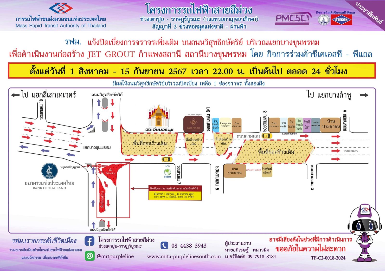 การรถไฟฟ้าขนส่งมวลชนแห่งประเทศไทย (รฟม.) แจ้งว่า กิจการร่วมค้า ซีเคเอสที-พีแอล ผู้รับจ้างออกแบบและก่อสร้างอุโมงค์ทางวิ่งและสถานีใต้ดิน โครงการรถไฟฟ้าสายสีม่วง ช่วงเตาปูน - ราษฎร์บูรณะ (วงแหวนกาญจนาภิเษก) สัญญาที่ 2 ช่วงหอสมุดแห่งชาติ - ผ่านฟ้า มีความจำเป็นต้องปิดเบี่ยงจราจรเพิ่มเติม บนถนนวิสุทธิกษัตริย์ บริเวณแยกบางขุนพรหม เพื่อดำเนินการก่อสร้าง JET GROUT กำแพงสถานี บริเวณสถานีบางขุนพรหม ตั้งแต่วันที่ 1 สิงหาคม – 15 กันยายน 2567 เวลา 22.00 น. เป็นต้นไป ตลอด 24 ชั่วโมง มีผลให้ถนนวิสุทธิกษัตริย์บริเวณปิดเบี่ยง สามารถสัญจรได้ฝั่งละ 1 ช่องจราจร