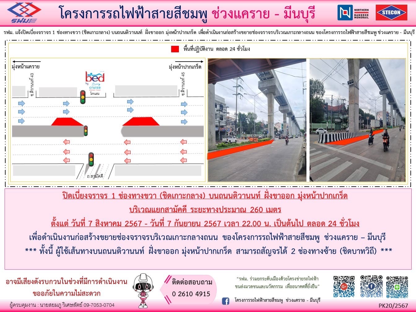 การรถไฟฟ้าขนส่งมวลชนแห่งประเทศไทย (รฟม.) แจ้งว่า บริษัท ซิโน-ไทย เอ็นจีเนียริ่ง แอนด์ คอนสตรัคชั่น จำกัด (มหาชน) ผู้รับจ้างก่อสร้างงานโยธา โครงการรถไฟฟ้าสายสีชมพู ช่วงแคราย - มีนบุรี มีความจำเป็นต้องปิดเบี่ยงจราจร 1 ช่องทางขวา (ชิดเกาะกลาง) บนถนนติวานนท์ ฝั่งขาออก มุ่งหน้าปากเกร็ด บริเวณแยกสามัคคี ระยะทางประมาณ 260 เมตร ตั้งแต่ วันที่ 7 สิงหาคม 2567 - วันที่ 7 กันยายน 2567 เวลา 22.00 น. เป็นต้นไป ตลอด 24 ชั่วโมง เพื่อดำเนินงานก่อสร้างขยายช่องจราจรบริเวณเกาะกลางถนนโครงการรถไฟฟ้าสายสีชมพู ช่วงแคราย – มีนบุรี ทั้งนี้ ผู้ใช้เส้นทางบนถนนติวานนท์ ฝั่งขาออก มุ่งหน้าปากเกร็ด บริเวณที่ปิดเบี่ยงจราจร สามารถสัญจรได้ 2 ช่องทางซ้าย (ชิดบาทวิถี)