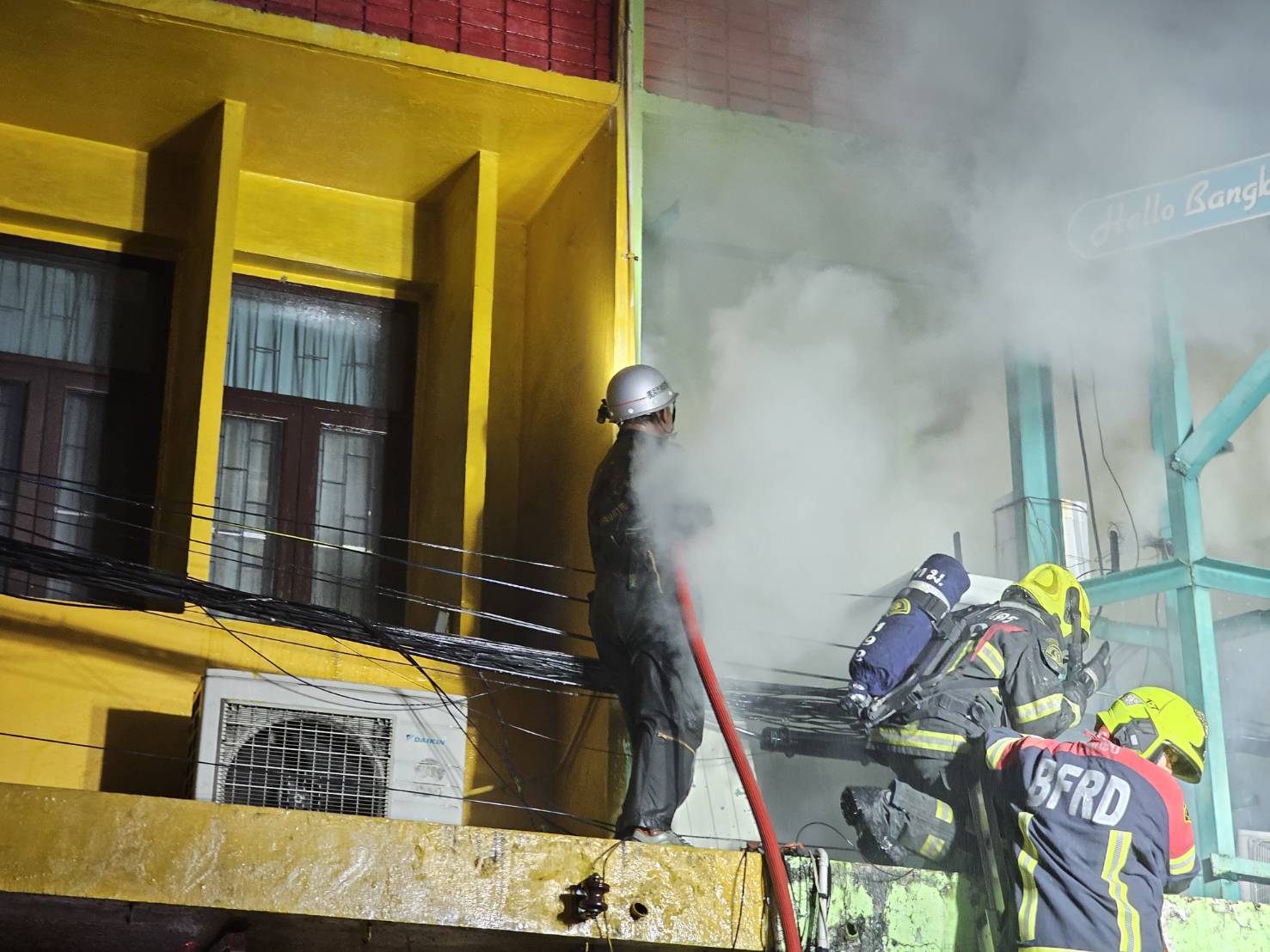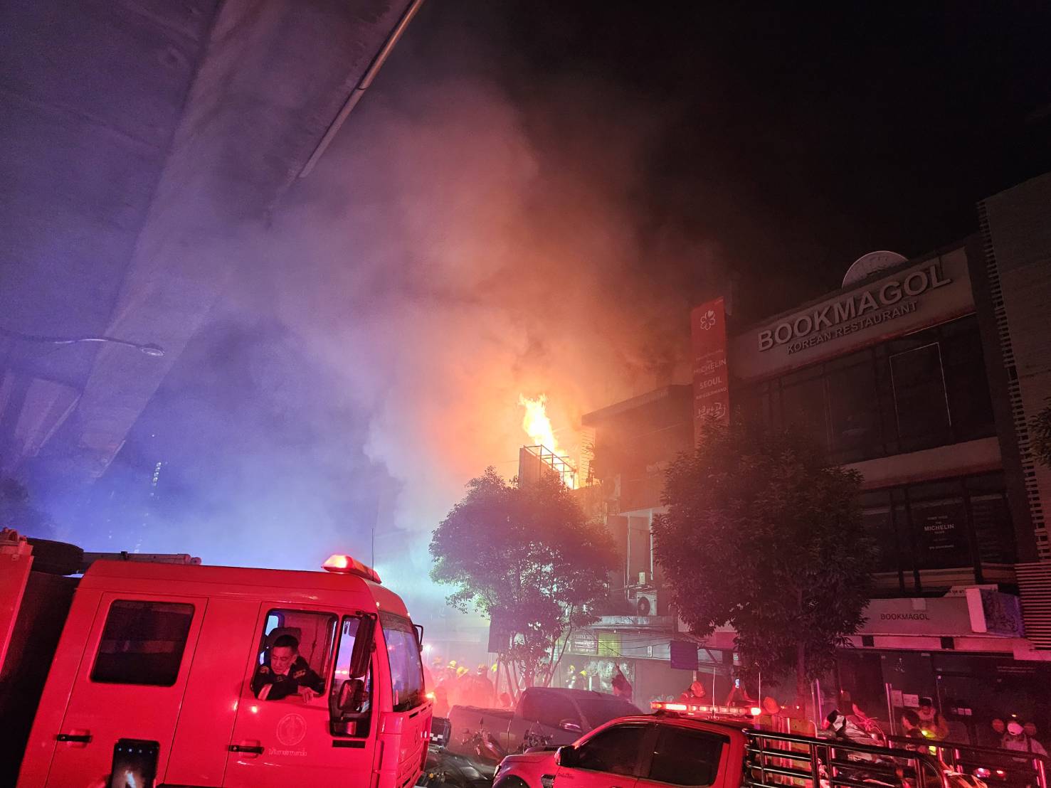 ไฟไหม้บนอาคารพาณิชย์ ริมถนนสุขุมวิท เจ้าหน้าที่พร้อมด้วยรถดับเพลิง เร่งระดมหัวฉีดน้ำเพื่อควบคุมเพลิง