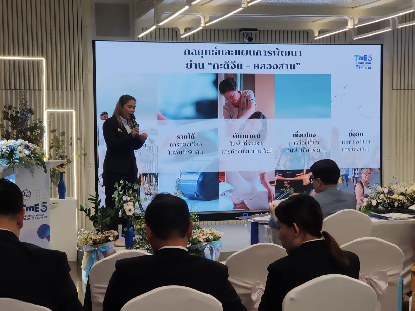หลักสูตรการบริหารการท่องเที่ยวสำหรับผู้บริหารระดับสูง รุ่นที่ 5 นี้ ดำเนินการภายใต้แนวคิด Reshaping the Future of Tourism โดยมีการออกแบบหลักสูตรให้ทันสมัย สอดคล้องกับความต้องการของตลาด โดยแบ่งหลักสูตรการฝึกอบรมออกเป็น 5 ชุดความรู้ ประกอบขึ้นจาก Keyword สำคัญ “TRIPS” ประกอบด้วย ชุดที่ 1: (T) Trends in Tourism เปิดมุมมองแนวโน้มการท่องเที่ยวและพฤติกรรมนักท่องเที่ยวที่เปลี่ยนแปลงไปในระดับต่าง ๆ (Trends in Tourism: Thailand, Global & Customer) ชุดที่ 2: (R) Responsible & Sustainable Tourism แลกเปลี่ยนกลยุทธ์และแนวทางการนำแนวคิดการท่องเที่ยวอย่างรับผิดชอบไปปฏิบัติจริงในเชิงธุรกิจ (Responsible & Sustainable Tourism: Strategy & Implication) ชุดที่ 3: (I) Innovation in Tourism Management เรียนรู้นวัตกรรมและเทคโนโลยีที่จะช่วยขับเคลื่อนและเพิ่มคุณค่าประสบการณ์การท่องเที่ยวในยุคดิจิทัล (Innovation in Tourism Management: Technology Integration for Personalization & Experience) ชุดที่ 4: (P) Persona, Communication & Soft Power ยกระดับประสบการณ์การท่องเที่ยวที่น่าจดจำผสานเรื่องราวของวัฒนธรรมไทยที่มีความหลากหลาย (Persona, Communication & Soft Power: Cultural Exchange for Authentic Experiences) และ ชุดที่ 5: (S) Strategic Ecosystem Mobilization for Future of Tourism ขับเคลื่อนสู่อนาคตของอุตสาหกรรมการท่องเที่ยวผสานและผนวกรวมทักษะหลากหลายแขนงสู่ความยั่งยืน (Strategic Ecosystem Mobilization for Future of Tourism: Readiness for Next Changes) นอกจากนี้ ยังมีกิจกรรมศึกษาดูงานเพื่อเพิ่มพูนประสบการณ์ทั้งในประเทศและต่างประเทศ ได้แก่ กิจกรรมสัมพันธ์แบบพักค้างแรม ณ จังหวัดพระนครศรีอยุธยา จัดการศึกษาดูงานในประเทศ (จังหวัดเพชรบุรี) 1 ครั้ง จัดการศึกษาดูงานต่างประเทศ 4 วัน 3 คืน ณ สหรัฐอาหรับเอมิเรตส์ 1 ครั้ง จัดการศึกษาดูงานในพื้นที่กรุงเทพฯ และปริมณฑล 2 ครั้ง รวมถึงผู้อบรมยังได้มีโอกาสนำเสนอแผนยุทธศาสตร์การท่องเที่ยวจากเนื้อหาและองค์ความรู้ที่ได้อบรมมาตลอดทั้งหลักสูตร ที่พร้อมนำไปประยุกต์ใช้ในการส่งเสริมการท่องเที่ยวต่อไป