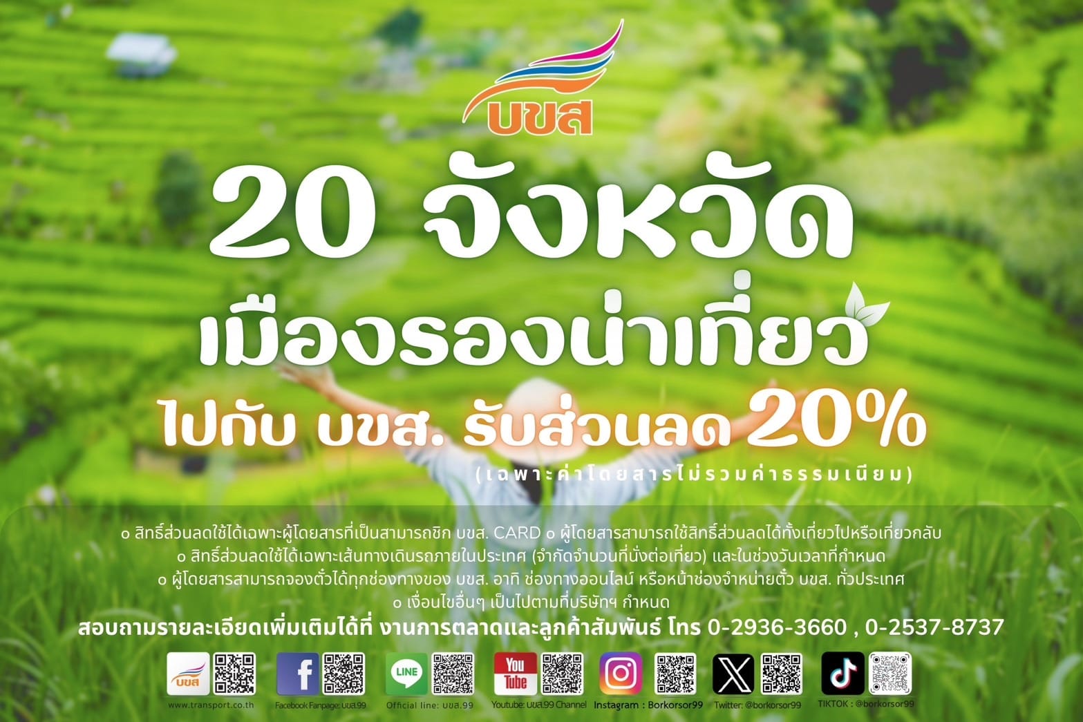 ทั้งนี้ ขอย้ำว่า กิจกรรม “เมืองรองน่าเที่ยว ไปกับ บขส. รับส่วนลด 20%” ยังจัดอย่างต่อเนื่อง โดยในเดือน ส.ค.นี้ จะจัดในพื้นที่เมืองรองภาคตะวันออกเฉียงเหนือ (อีสาน) และภาคตะวันออก จำนวน 5 จังหวัด ประกอบด้วย อุบลราชธานี, นครพนม, ศรีสะเกษ, ตราด (แหลมงอบ) และ จันทบุรี โดย บขส. มีเส้นทางสนับสนุนการท่องเที่ยว ผู้โดยสารสามารถใช้สิทธิ์ส่วนลดเดินทางได้ระหว่างวันที่ 15 - 31 ส.ค. 2567 จำนวน 4 เส้นทาง ได้แก่ กรุงเทพฯ - ทุ่งศรีอุดม – บุณฑริก, กรุงเทพฯ - ศรีสะเกษ (แยกปักธงชัย), กรุงเทพฯ - อุบลราชธานี และ กรุงเทพฯ (เอกมัย) - แหลมงอบ