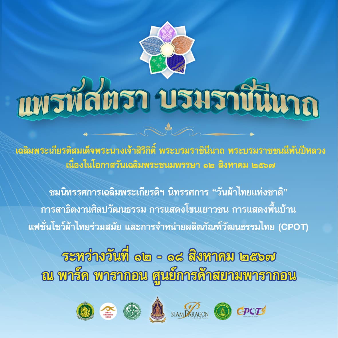 นางสาวสุดาวรรณ หวังศุภกิจโกศล รัฐมนตรีว่าการกระทรวงวัฒนธรรม กล่าวว่า กระทรวงวัฒนธรรม (วธ.) ร่วมกับศูนย์การค้าสยามพารากอนหน่วยงานรัฐ ภาคเอกชนและภาคีเครือข่ายทางวัฒนธรรม จัดงานเฉลิมพระเกียรติสมเด็จพระนางเจ้าสิริกิติ์ พระบรมราชินีนาถ พระบรมราชชนนีพันปีหลวง เนื่องในโอกาสวันเฉลิมพระชนมพรรษา 12 สิงหาคม 2567 ในชื่องาน “แพรพัสตรา บรมราชินีนาถ” ระหว่างวันที่ 12 - 18 สิงหาคม 2567 เวลา 11.00 – 21.00 น. โดยจะมีพิธีเปิดงานและพิธีถวายราชสักการะสมเด็จพระนางเจ้าสิริกิติ์ พระบรมราชินีนาถ พระบรมราชินีพันปีหลวง ในวันที่ 12 สิงหาคม 2567 เวลา 11.30 น. และในช่วงเย็น เวลา 19.00 ขอเชิญชวนเหล่าพสกนิกรร่วมจุดเทียนถวายพระพรชัยมงคลพร้อมกัน ณ พาร์ค พารากอน ชั้นเอ็ม ศูนย์การค้าสยามพารากอน กรุงเทพฯ โดยการจัดงานภายใต้ชื่องาน “แพรพัสตรา บรมราชินีนาถ” ในครั้งนี้ เพื่อน้อมสำนึกในพระมหากรุณาธิคุณของสมเด็จพระนางเจ้าสิริกิติ์ พระบรมราชินีนาถ พระบรมราชชนนีพันปีหลวงที่ทรงปฏิบัติพระราชกรณียกิจนานัปการเพื่อประโยชน์สุขของพสกนิกรชาวไทย ทรงอนุรักษ์ ฟื้นฟูศิลปวัฒนธรรมของชาติ ส่งเสริมงานหัตถศิลป์ และงานหัตถกรรมของไทย รวมถึงทรงอนุรักษ์ ส่งเสริมมรดกภูมิปัญญา “ผ้าไทย” ยกระดับผ้าไทยให้มีความโดดเด่นจนเป็นที่ประจักษ์แก่สายตานานาชาติ