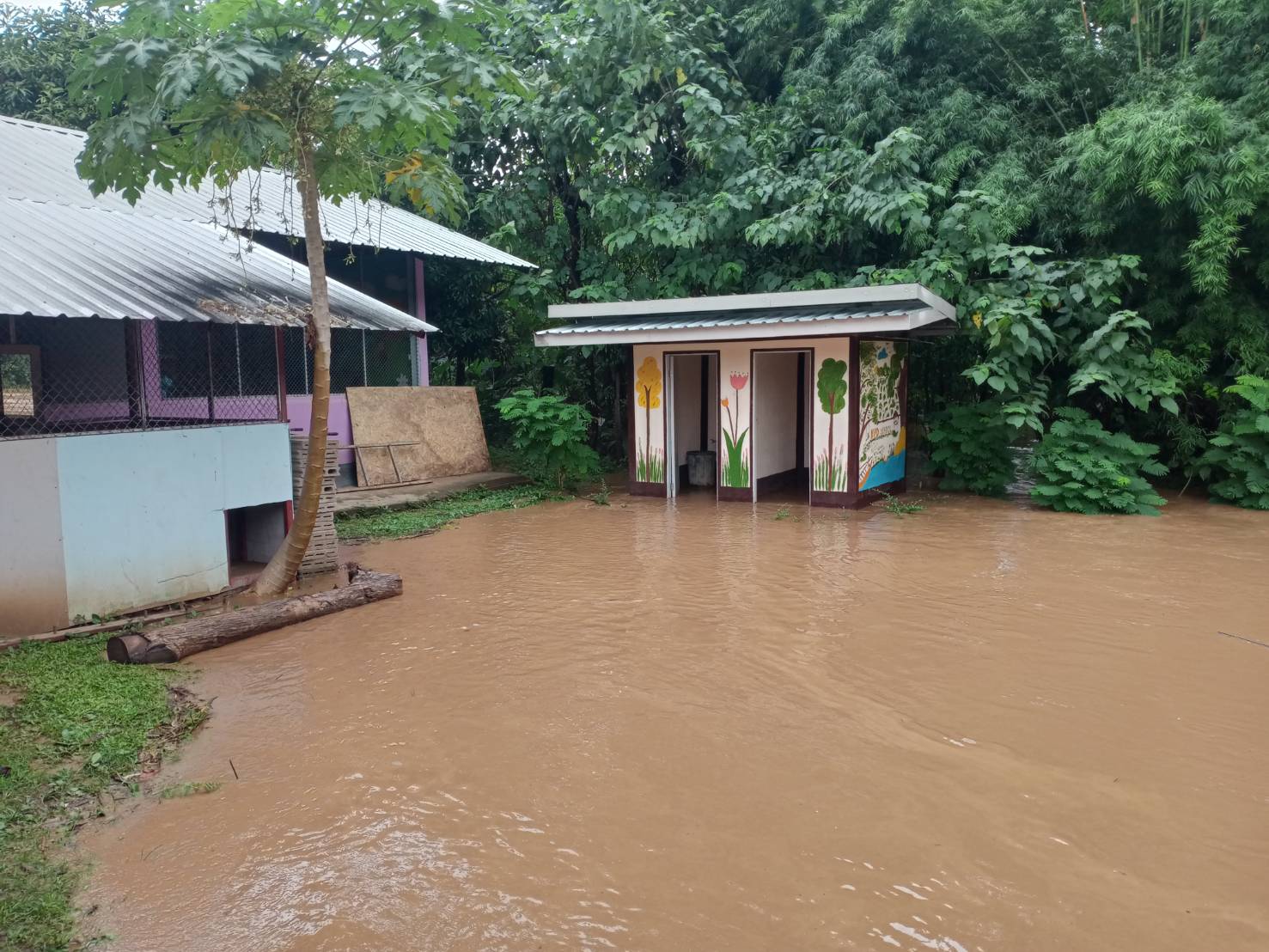 6) บ้านห้วยปูแกง หมู่บ้านท่องเที่ยวกะเหรี่ยงคอยาว เกิดน้ำท่วมได้เอ่อล้นท่วมห้องครัว ห้องน้ำที่โรงเรียนชุมชนห้วยปูแกง ชาวบ้านผู้นำจิตอาสาในหมู่บ้านจึงช่วยกันขนข้าวของขึ้นพื้นที่สูง