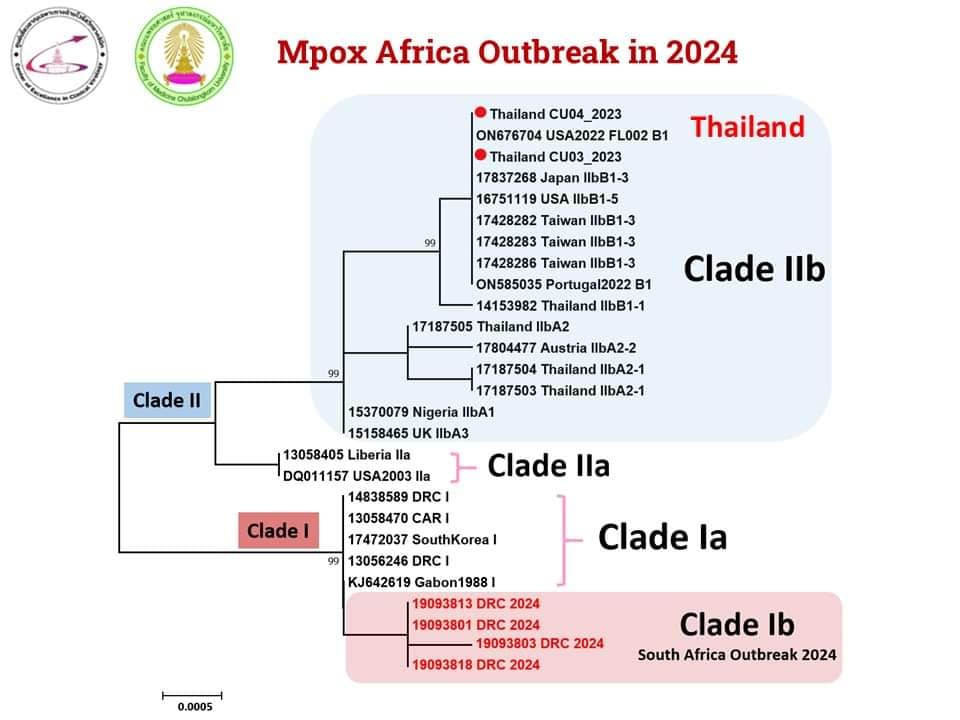 โดยระบุว่า ในปัจจุบันจากการถอดรหัส DNA จะแยกฝีดาษวานร เป็น 2 กลุ่ม (Clade) คือกลุ่มหนึ่งและกลุ่ม 2 สายพันธุ์ที่ระบาดในแอฟริกาส่วนใหญ่จะเป็นกลุ่มที่ 1 และการระบาดนอกแอฟริกาส่วนใหญ่จะเป็นกลุ่มที่ 2 ทั้งกลุ่ม 1 และกลุ่ม 2 ยังแยกเป็นกลุ่มย่อย a และ b การระบาดนอกแอฟริกาจะเป็นสายพันธุ์กลุ่ม 2b