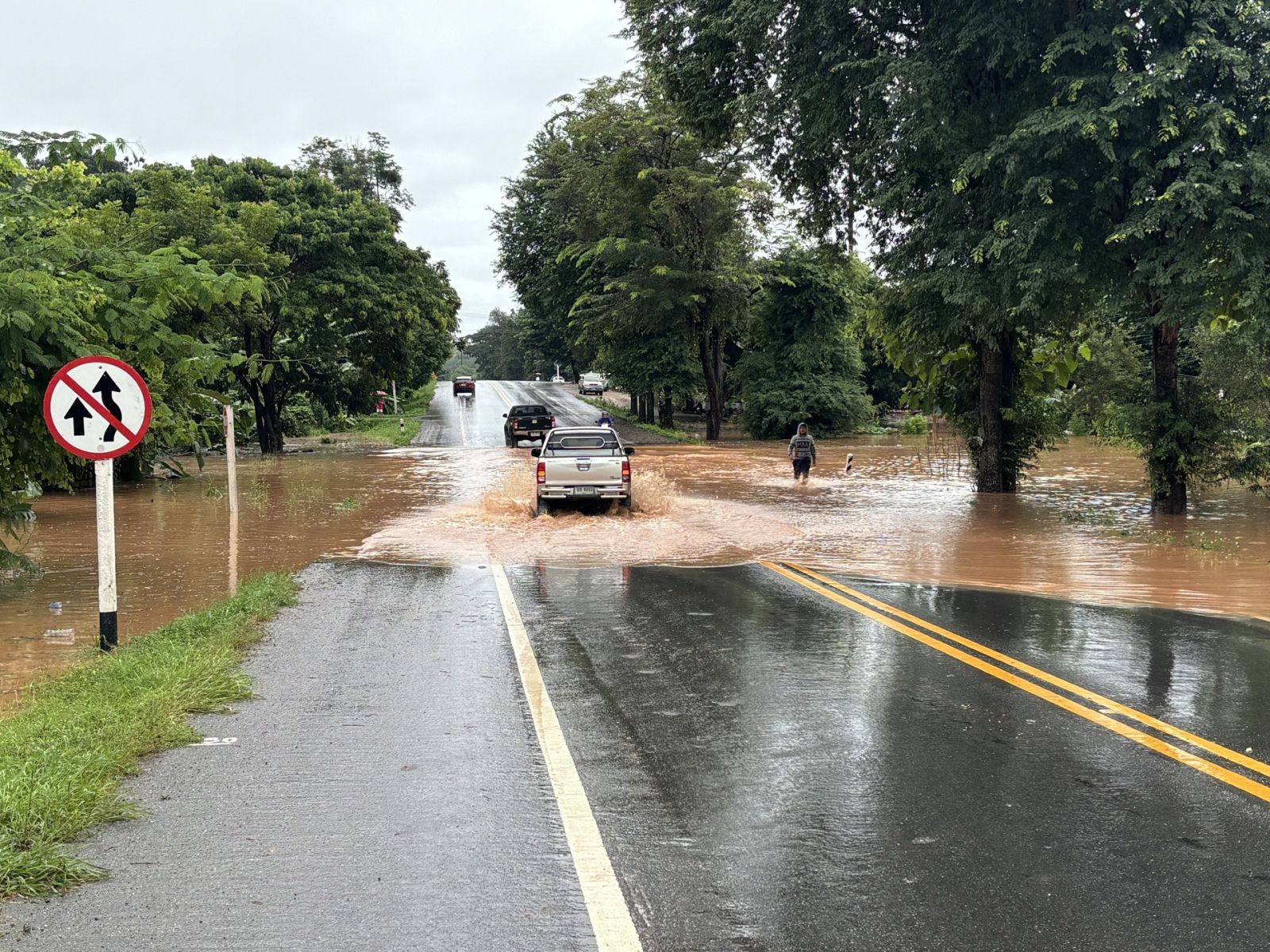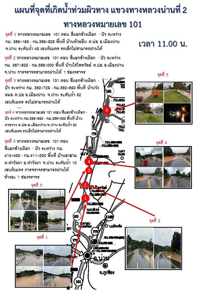 4. ทางหลวงหมายเลข 101 ตอน สี่แยกช้างเผือก - ปัว ระหว่าง กม.398+850 - กม.399+000 พื้นที่ บ้านผาขวาง ต.บ่อ อ.เมืองน่าน จ.น่าน ระดับน้ำ 30 เซนติเมตร รถเล็กไม่สามารถผ่านได้