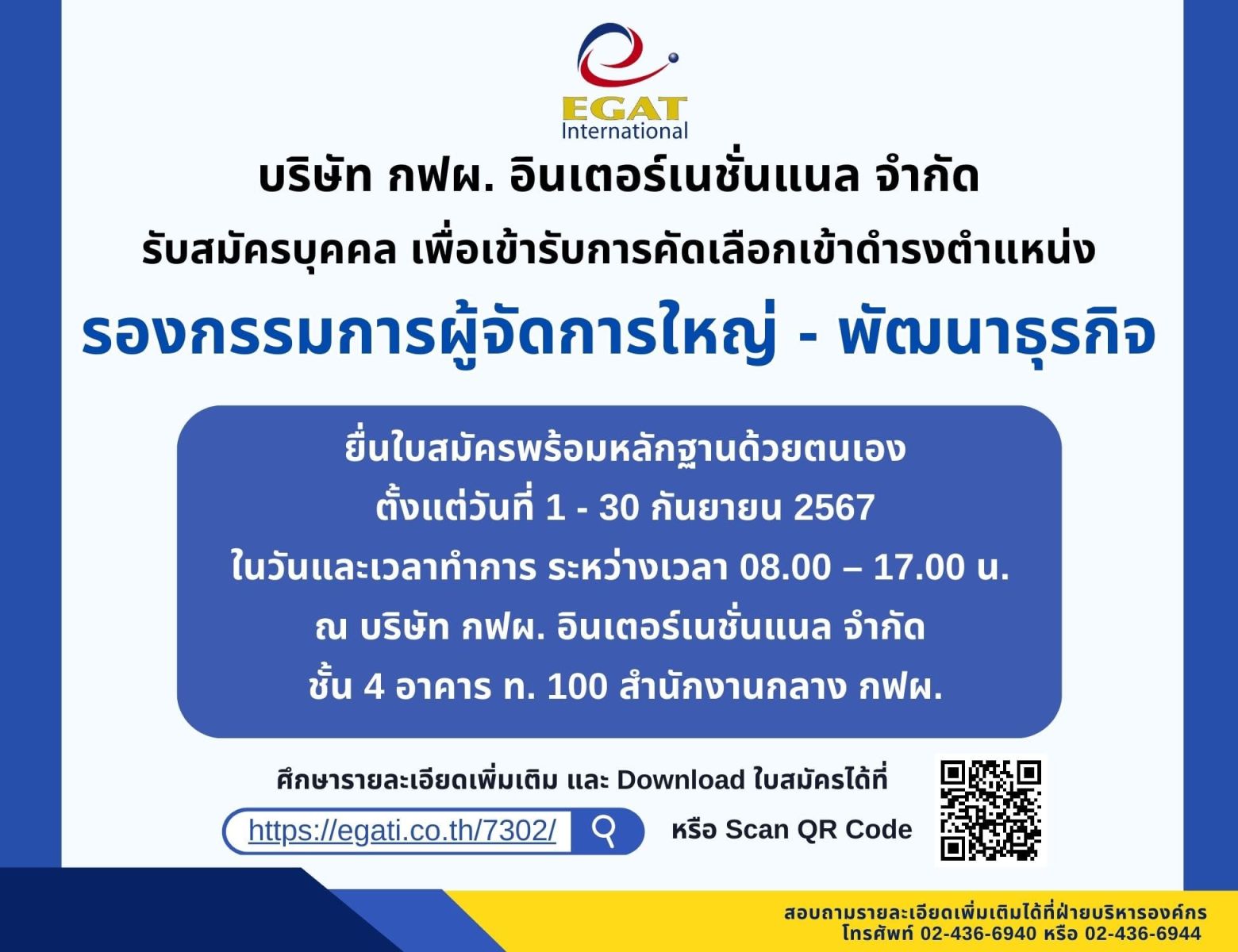 2. ตำแหน่งรองกรรมการผู้จัดการใหญ่ – พัฒนาธุรกิจ กำหนดยื่นใบสมัคร ระหว่างวันที่ 1 – 30 กันยายน 2567 สามารถดูรายละเอียดเพิ่มเติม พร้อมทั้งดาวน์โหลดใบสมัคร ที่เว็บไซต์ https://egati.co.th/th/7302/