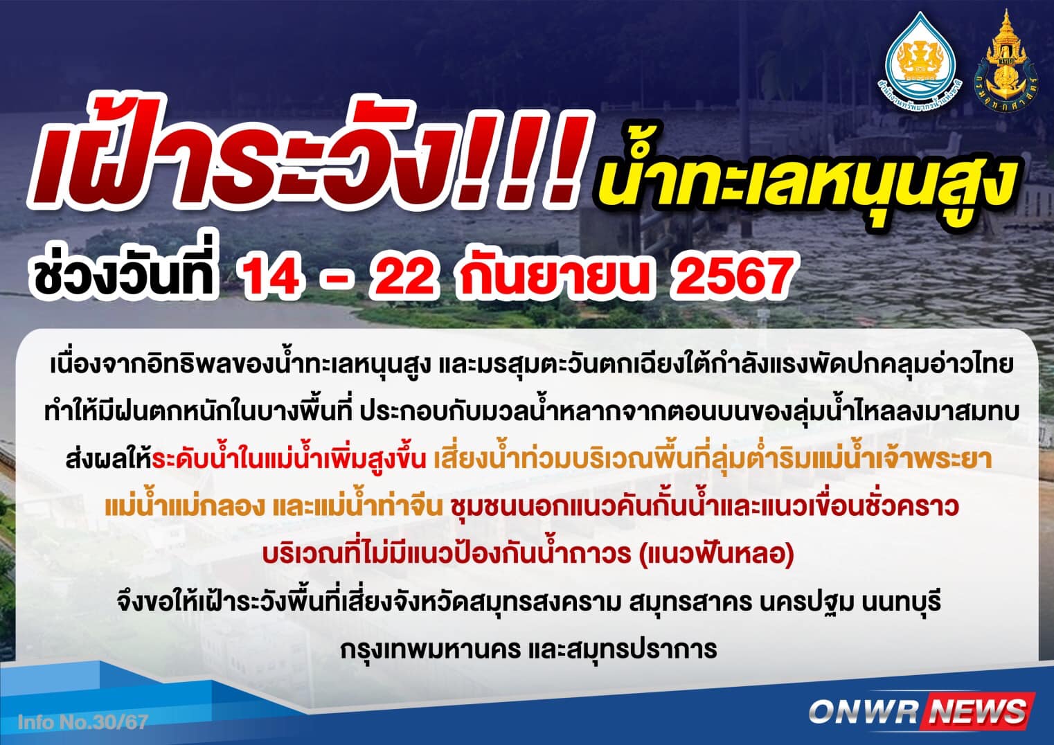 สำนักงานทรัพยากรน้ำแห่งชาติ (สทนช.) ประกาศ เฝ้าระวัง! น้ำทะเลหนุนสูง ช่วงวันที่ 14 - 22 กันยายน 2567