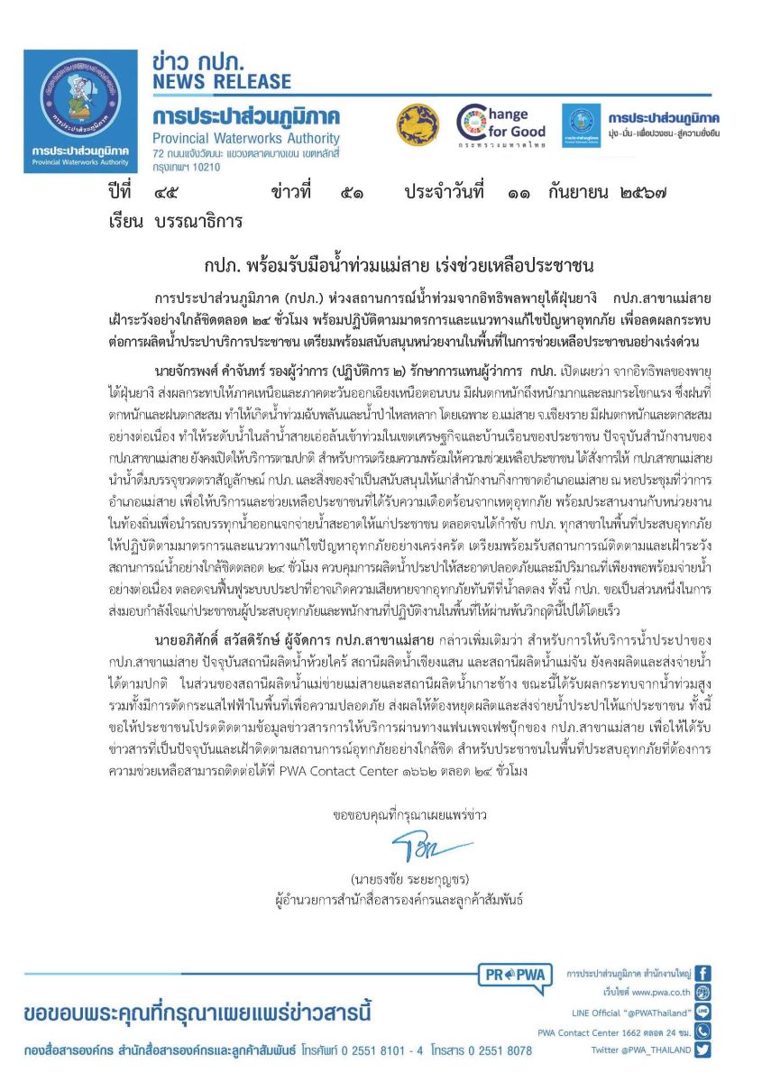 นายอภิศักดิ์ สวัสดิรักษ์ ผู้จัดการ กปภ.สาขาแม่สาย กล่าวเพิ่มเติมว่า สำหรับการให้บริการน้ำประปาของ กปภ.สาขาแม่สาย ปัจจุบันสถานีผลิตน้ำห้วยไคร้ สถานีผลิตน้ำเชียงแสน และสถานีผลิตน้ำแม่จัน ยังคงผลิตและส่งจ่ายน้ำได้ตามปกติ ในส่วนของสถานีผลิตน้ำแม่ข่ายแม่สายและสถานีผลิตน้ำเกาะช้าง ขณะนี้ได้รับผลกระทบจากน้ำท่วมสูง รวมทั้งมีการตัดกระแสไฟฟ้าในพื้นที่เพื่อความปลอดภัย ส่งผลให้ต้องหยุดผลิตและส่งจ่ายน้ำประปาให้แก่ประชาชน ทั้งนี้ ขอให้ประชาชนโปรดติดตามข้อมูลข่าวสารการให้บริการผ่านทางแฟนเพจเฟซบุ๊กของ กปภ.สาขาแม่สาย เพื่อให้ได้รับข่าวสารที่เป็นปัจจุบันและเฝ้าติดตามสถานการณ์อุทกภัยอย่างใกล้ชิด สำหรับประชาชนในพื้นที่ประสบอุทกภัยที่ต้องการความช่วยเหลือสามารถติดต่อได้ที่ PWA Contact Center 1662 ตลอด 24 ชั่วโมง