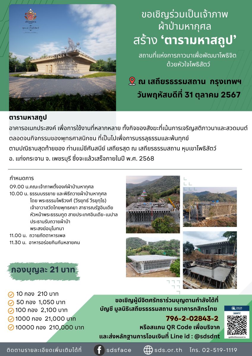 ขอเชิญร่วมเป็นเจ้าภาพผ้าป่ามหากุศล สร้าง ‘ตารามหาสถูป’ สถานที่แห่งการภาวนาเพื่อพัฒนาโพธิจิตด้วยหัวใจโพธิสัตว์ ณ เสถียรธรรมสถาน กรุงเทพมหานคร วันพฤหัสบดีที่ 31 ตุลาคม 2567