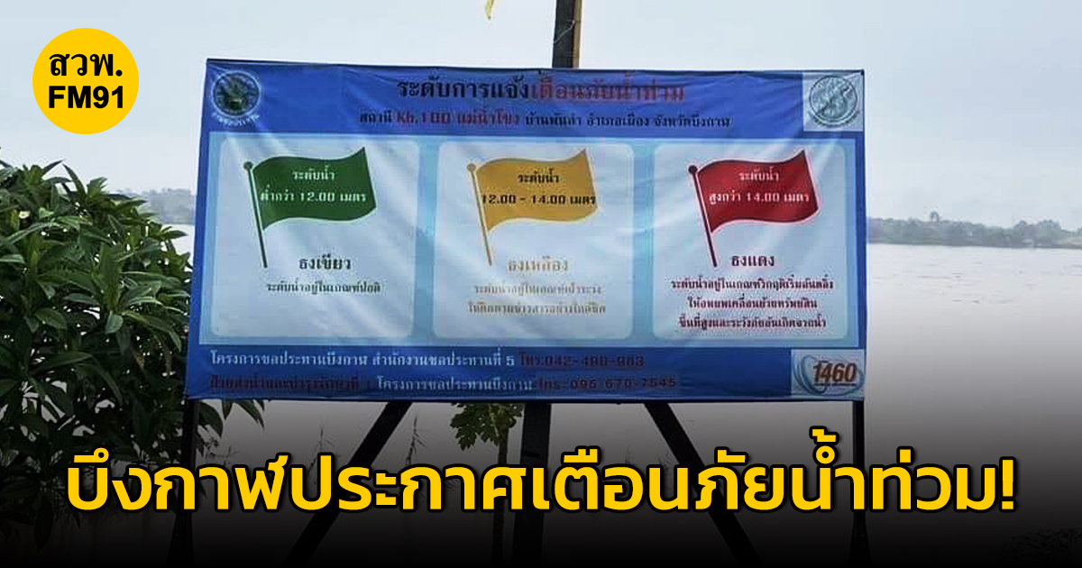 วันที่ 13 กันยายน 2567 จังหวัดบึงกาฬได้ประกาศเตือนภัยน้ำท่วม โดยได้มีการเปลี่ยนธงเตือนภัยเป็นสีเหลือง ซึ่งเป็นสัญญาณบ่งบอกว่าสถานการณ์น้ำท่วมอยู่ในระดับเสี่ยงอันตรายและมีแนวโน้มรุนแรงมากขึ้น ประชาชนในพื้นที่เสี่ยงภัยจึงควรเตรียมพร้อมรับมือกับสถานการณ์ที่อาจเกิดขึ้นได้ทุกเมื่อ