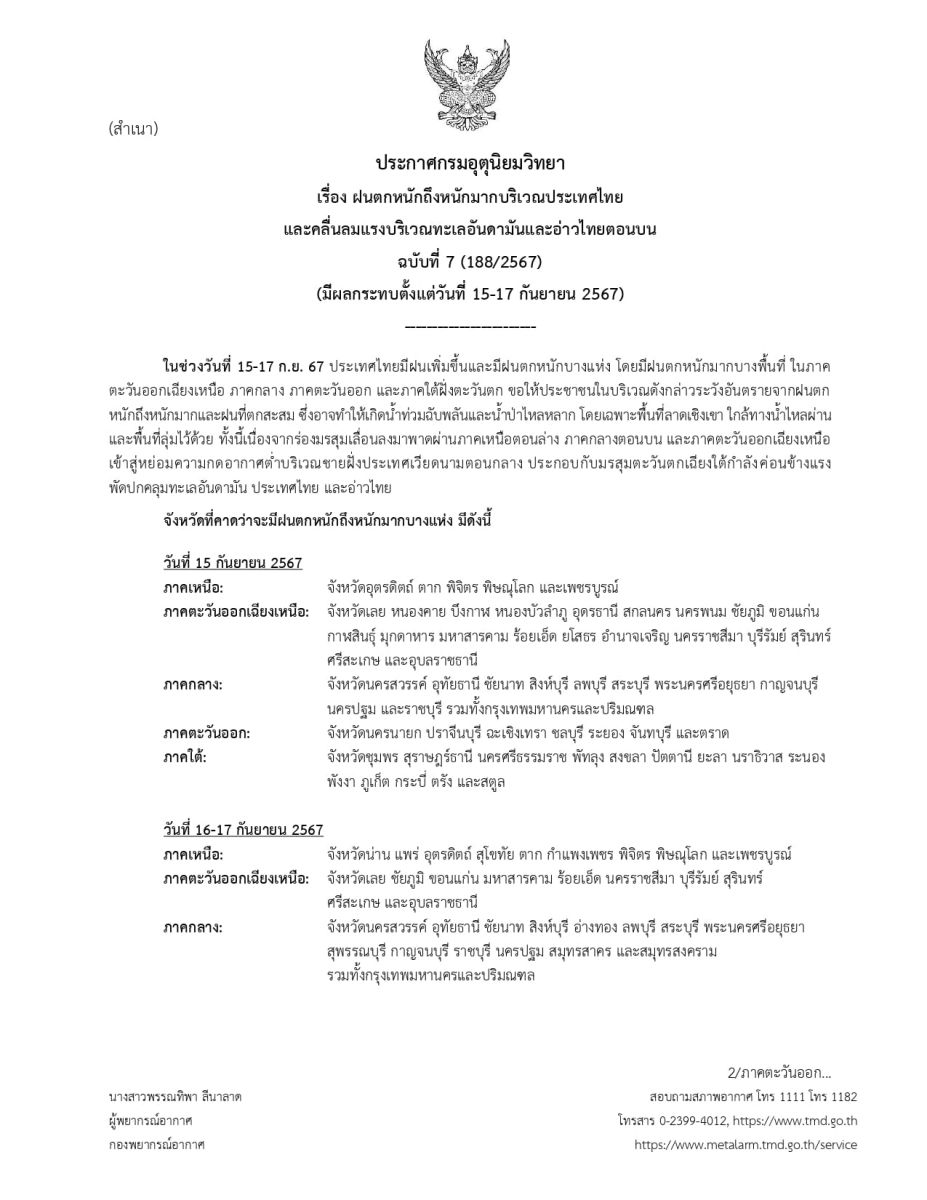 กรมอุตุนิยมวิทยาประกาศเตือน ในช่วงวันที่ 15-17 ก.ย. 67 ประเทศไทยมีฝนเพิ่มขึ้นและมีฝนตกหนักบางแห่ง โดยมีฝนตกหนักมากบางพื้นที่ ในภาคตะวันออกเฉียงเหนือ ภาคกลาง ภาคตะวันออก และภาคใต้ฝั่งตะวันตก ขอให้ประชาชนในบริเวณดังกล่าวระวังอันตรายจากฝนตกหนักถึงหนักมากและฝนที่ตกสะสม ซึ่งอาจทำให้เกิดน้ำท่วมฉับพลันและน้ำป่าไหลหลาก โดยเฉพาะพื้นที่ลาดเชิงเขา ใกล้ทางน้ำไหลผ่าน และพื้นที่ลุ่มไว้ด้วย