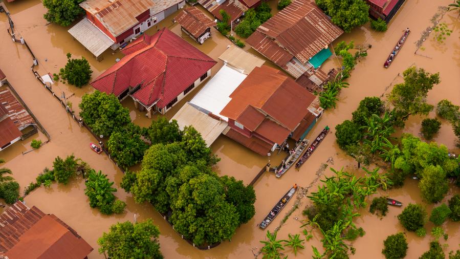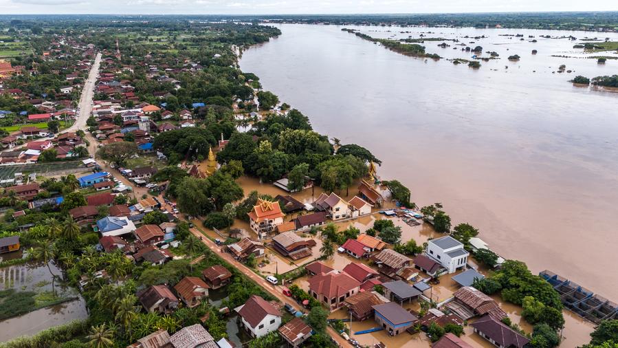 เวียงจันทน์, 16 ก.ย. ซินหัว ได้ประมวลภาพบ้านเรือนประชาชนและพื้นที่ริมแม่น้ำโขงที่ประสบภัยน้ำหลากท่วมในนครหลวงเวียงจันทน์ของลาว หลังจากระดับน้ำของแม่น้ำโขงในเวียงจันทน์เพิ่มขึ้นอย่างรวดเร็วเพราะฝนตกหนักในระยะนี้