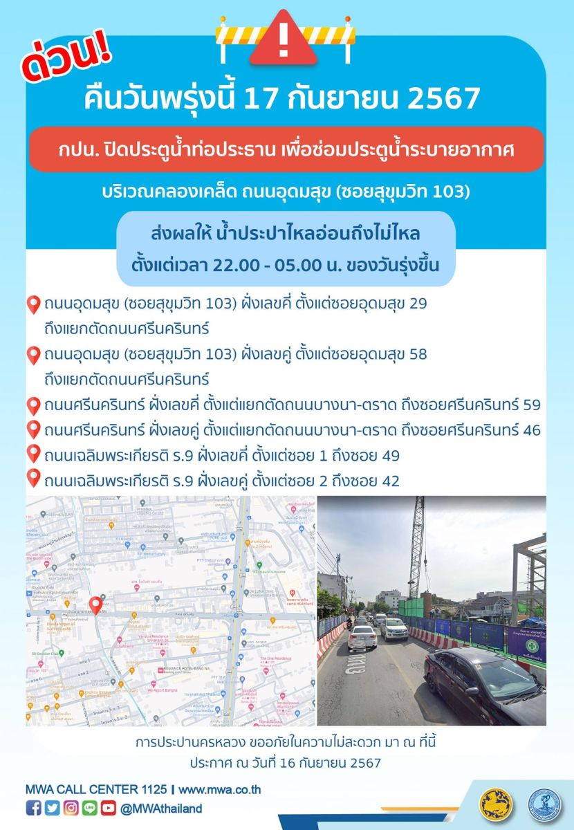 การประปานครหลวง (กปน.) มีความจำเป็นต้องปิดประตูน้ำท่อประธานขนาดเส้นผ่านศูนย์กลาง 1,000 มิลลิเมตร เพื่อซ่อมประตูน้ำระบายอากาศ บริเวณคลองเคล็ด ถนนอุดมสุข (ซอยสุขุมวิท 103) ในคืนวันพรุ่งนี้ (วันอังคารที่ 17 กันยายน 2567) ตั้งแต่เวลา 22.00 - 05.00 น. ของวันรุ่งขึ้น เพื่อให้ประชาชนได้รับบริการน้ำประปาอย่างเพียงพอและทั่วถึง โดยระหว่างดำเนินการ ส่งผลให้ น้ำประปาไหลอ่อนถึงไม่ไหล ในพื้นที่ดังต่อไปนี้