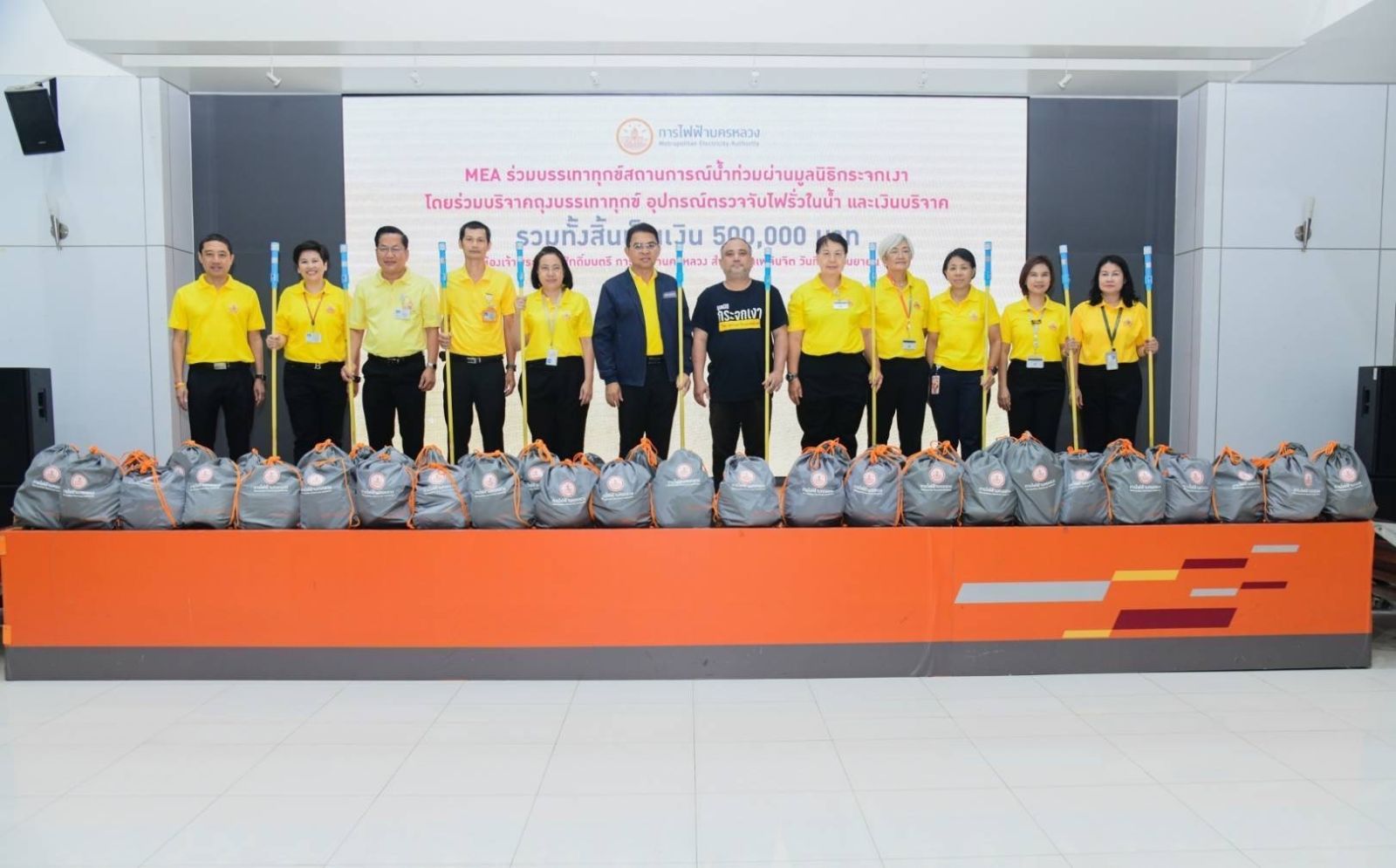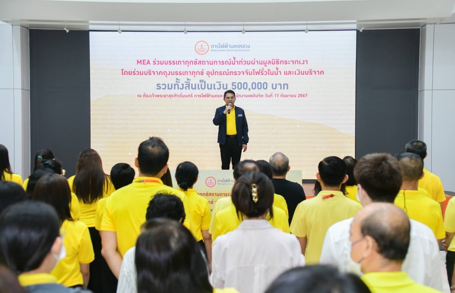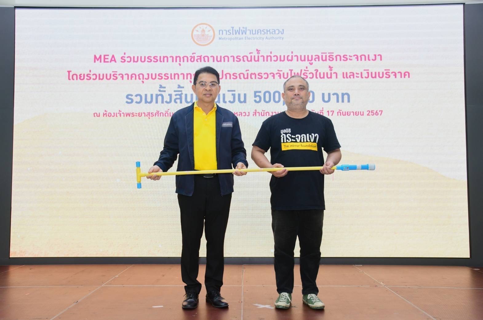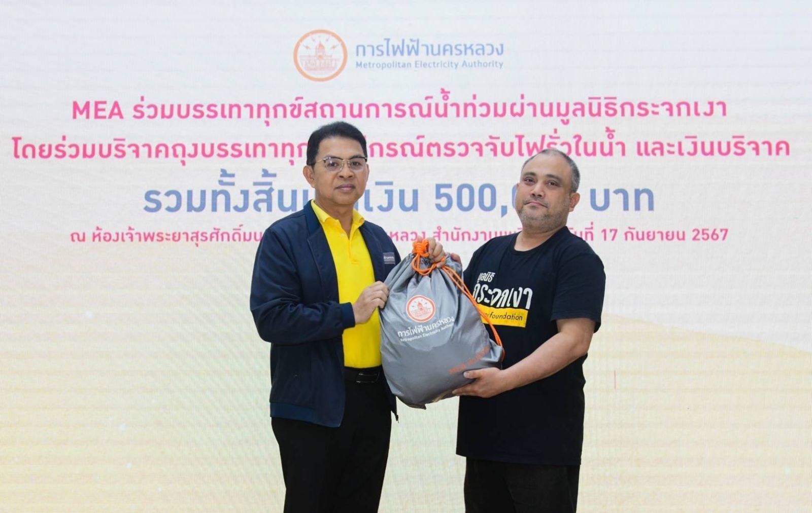 วันนี้ (17 กันยายน 2567) นายวิลาศ เฉลยสัตย์ ผู้ว่าการ MEA หรือการไฟฟ้านครหลวง เป็นประธานมอบเงินบริจาคช่วยเหลือผู้ประสบอุทกภัยจังหวัดเชียงราย จำนวน 500,000 บาท มอบถุงบรรเทาทุกข์ จำนวน 500 ชุด และอุปกรณ์ตรวจจับไฟฟ้ารั่วในน้ำ ให้แก่มูลนิธิกระจกเงา เพื่อนำไปส่งต่อร่วมบริจาคช่วยเหลือผู้ประสบอุทกภัยจังหวัดเชียงราย โดยมีคณะผู้บริหารและพนักงานจิตอาสา MEA ร่วมพลังส่งต่อถุงบรรเทาทุกข์และสิ่งของที่จำเป็นเพื่อนำไปช่วยเหลือประชาชนที่เดือดร้อนต่อไป ณ ห้องเจ้าพระยาสุรศักดิ์มนตรี การไฟฟ้านครหลวง สำนักงานเพลินจิต