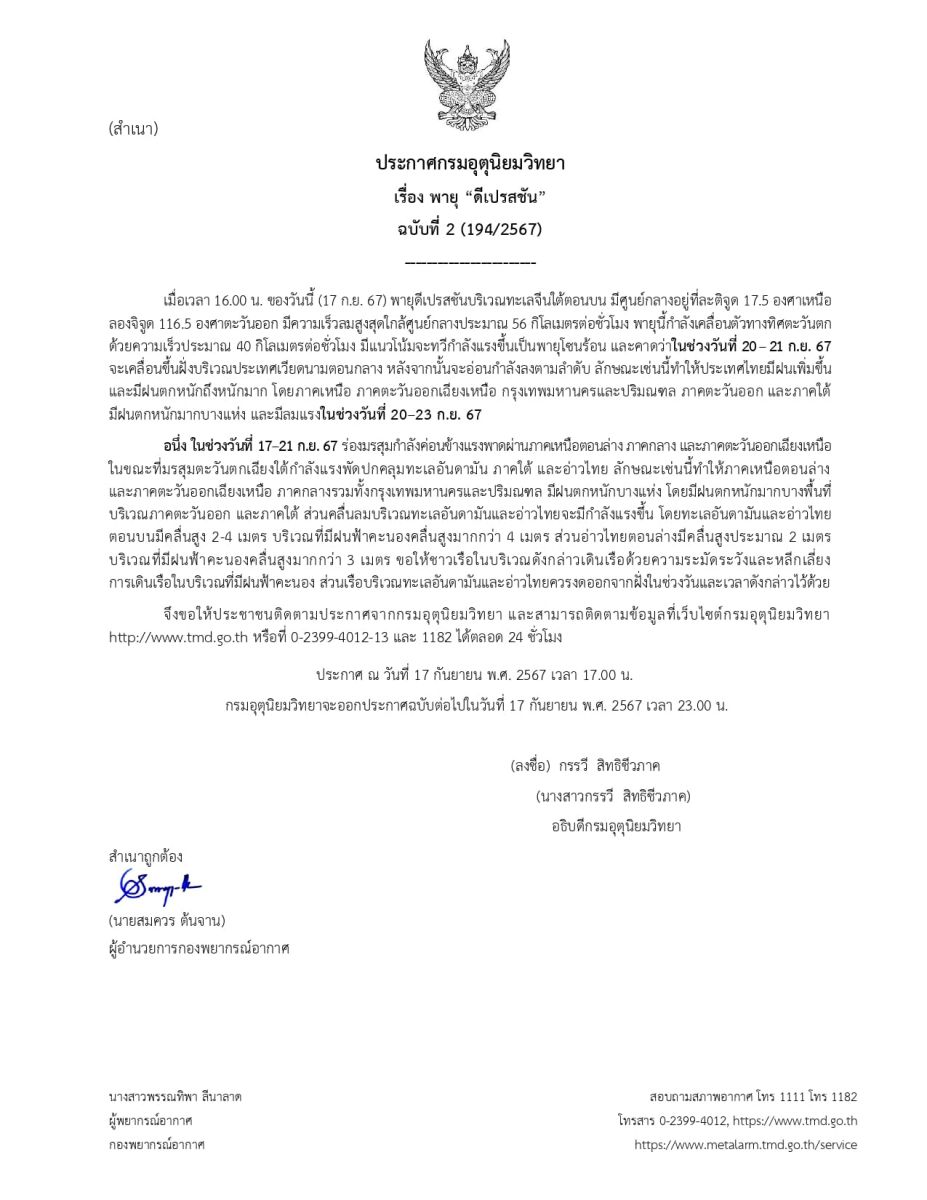 ประกาศกรมอุตุนิยมวิทยา พายุ “ดีเปรสชัน” ฉบับที่ 2 เมื่อเวลา 16.00 น. ของวันนี้ (17 ก.ย. 67) พายุดีเปรสชันบริเวณทะเลจีนใต้ตอนบน มีศูนย์กลางอยู่ที่ละติจูด 17.5 องศาเหนือ ลองจิจูด 116.5 องศาตะวันออก มีความเร็วลมสูงสุดใกล้ศูนย์กลางประมาณ 56 กิโลเมตรต่อชั่วโมง พายุนี้กำลังเคลื่อนตัวทางทิศตะวันตก ด้วยความเร็วประมาณ 40 กิโลเมตรต่อชั่วโมง มีแนวโน้มจะทวีกำลังแรงขึ้นเป็นพายุโซนร้อน และคาดว่าในช่วงวันที่ 20 – 21 ก.ย. 67 จะเคลื่อนขึ้นฝั่งบริเวณประเทศเวียดนามตอนกลาง หลังจากนั้นจะอ่อนกำลังลงตามลำดับ ลักษณะเช่นนี้ทำให้ประเทศไทยมีฝนเพิ่มขึ้นและมีฝนตกหนักถึงหนักมาก โดยภาคเหนือ ภาคตะวันออกเฉียงเหนือ กรุงเทพมหานครและปริมณฑล ภาคตะวันออก และภาคใต้มีฝนตกหนักมากบางแห่ง และมีลมแรงในช่วงวันที่ 20–23 ก.ย. 67