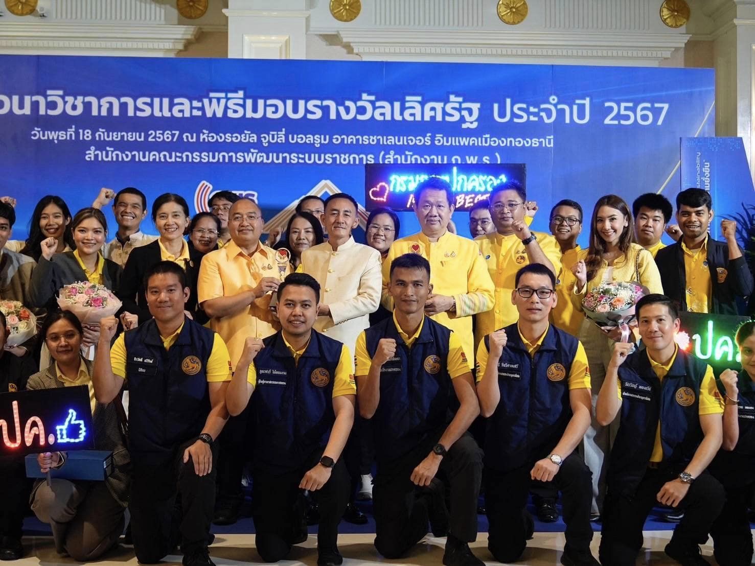 วันพุธที่ 18 กันยายน พ.ศ. 2567 เวลา 14.30 น. ณ ห้องรอยัล จูบิลี่ บอลรูม อาคารชาเลนเจอร์ อิมแพ็คเมืองทองธานี จังหวัดนนทบุรี รศ.ดร.ชูศักดิ์ ศิรินิล รัฐมนตรีประจำสำนักนายกรัฐมนตรี เป็นประธานในพิธีเปิดงานเสวนาวิชาการและพิธีมอบรางวัลเลิศรัฐ ประจำปี 2567 ในหัวข้อ “Transforming Public Service for Sustainability : พลิกโฉมบริการภาครัฐ สู่ความยั่งยืน” ณ ห้องรอยัล จูบิลี่ บอลรูม อาคารชาเลนเจอร์ อิมแพ็คเมืองทองธานี จังหวัดนนทบุรี โดย นายอรรษิษฐ์ สัมพันธรัตน์ อธิบดีกรมการปกครอง มอบหมายให้ นายวิรุฬห์ สิทธิวงศ์ ผู้อำนวยการสำนักการสอบสวนและนิติการ นายสุภณ สยามบุญนัญ ผู้อำนวยการสำนักบริหารการทะเบียน นายรณรงค์ ทิพย์ศิริ ผู้ตรวจราชการกรมการปกครอง และ นางสาวณิชนันทน์ สาริบุตร ผู้อำนวยการกลุ่มพัฒนาระบบบริหาร เข้ารับรางวัลเลิศรัฐ สาขารางวัลบริการภาครัฐ ระดับดี จำนวน 3 ประเภทรางวัล ได้แก่