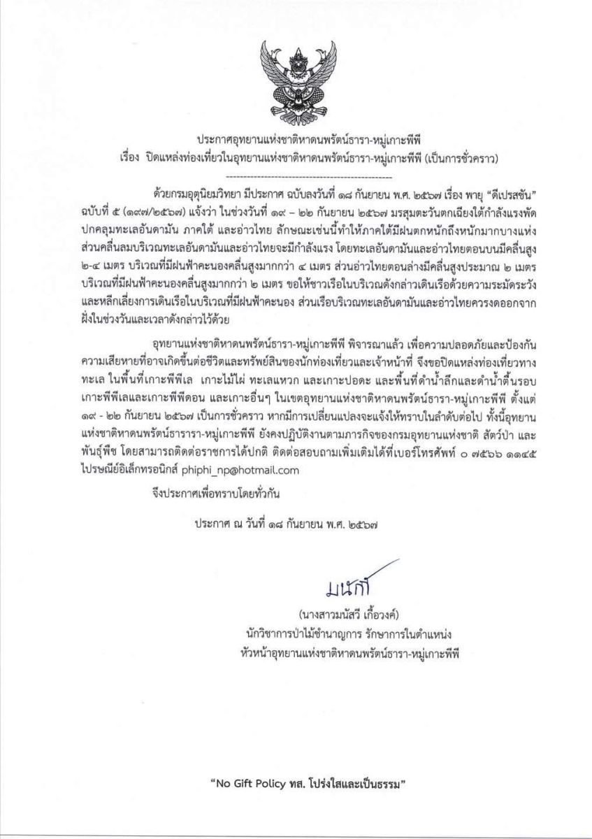 อุทยานแห่งชาติหาดนพรัตน์ธาราหมู่เกาะพีพี ประกาศปิดแหล่งท่องเที่ยวชั่วคราว 19-22 ก.ย นี้ วันที่ 19 ก.ย. 2567 เจ้าหน้าที่อุทยานแห่งชาติหาดนพรัตน์ธาราหมู่เกาะพีพี จ.กระบี่ ปักธงแดง ตามแหล่งท่องเที่ยวทางทะเล ต่างๆ ในพื้นที่ เนื่องจากทะเลมีคลื่นลมแรงต่อเนื่อง พร้อมประกาศปิดแหล่งท่องเที่ยวทางทะเล ประกอบด้วย เกาะพีพีเล เกาะไม้ไผ่ ทะเลแหวก เกาะปอดะ พื้นที่ดำน้ำลึกและดำน้ำตื้นรอบเกาะพีพีเลและเกาะพีพีดอน และเกาะอื่นๆ ใน ต.อ่าวนาง อ.เมืองกระบี่ ชั่วคราว ระหว่างวันที่ 19-22 ก.ย.นี้ เพื่อความปลอดภัย เนื่องจากมีฝนฟ้าคะนองคลื่นสูงมากกว่า 4 เมตร