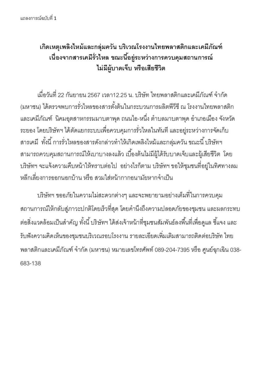 บริษัท ฯ ออกแถลงการณ์ฉบับที่ 1 เกิดเหตุเพลิงไหม้และกลุ่มควัน บริเวณโรงงานไทยพลาสติกและเคมีภัณฑ์ เนื่องจากสารเคมีรั่วไหล ขณะนี้อยู่ระหว่างการควบคุมสถานการณ์ ไม่มีผู้บาดเจ็บ หรือเสียชีวิต