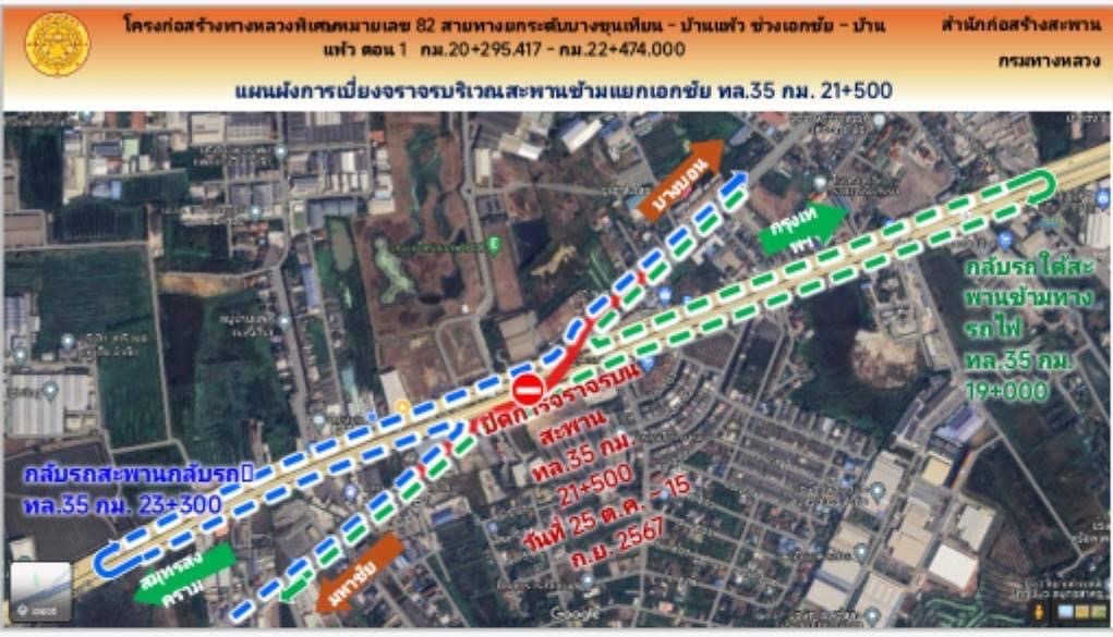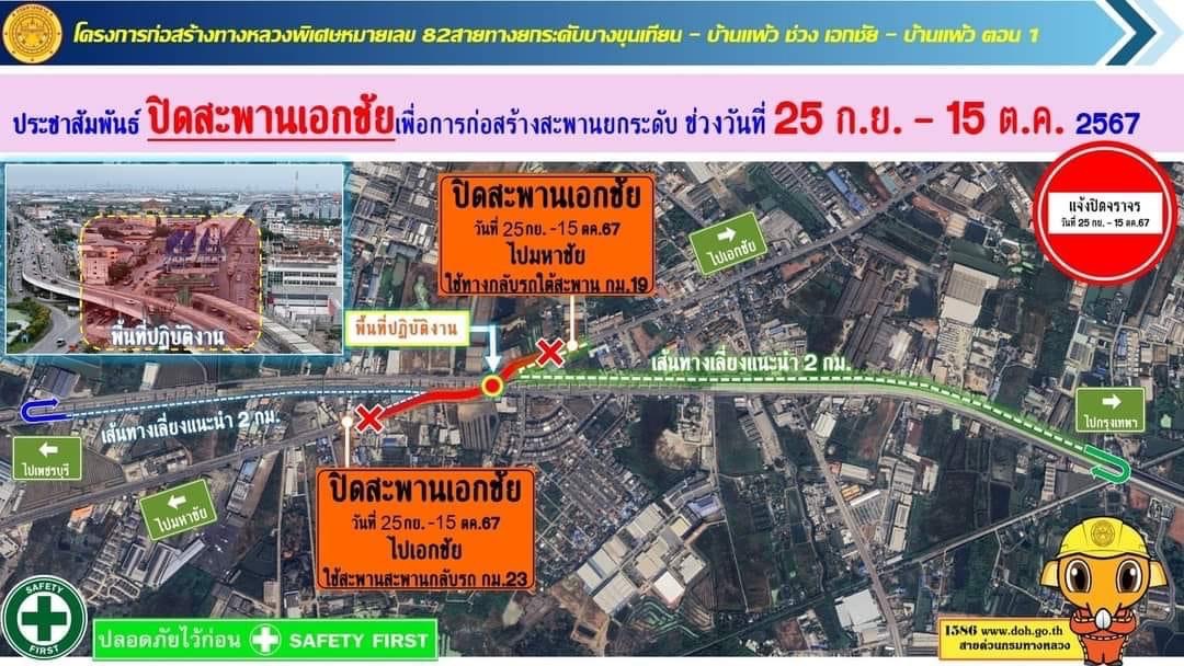 กรมทางหลวง ขอประชาสัมพันธ์ แจ้งปิดการจราจรสะพานต่างระดับเอกชัย พื้นที่ อ.เมือง จ.สมุทรสาคร บนทางหลวงหมายเลข 35 (ถนนพระรามที่ 2) เนื่องจาก โครงการก่อสร้างทางหลวงหมายเลข 82 (M82 ) จะดำเนินการติดตั้งชิ้นส่วนพื้นสะพาน (segment) ที่ กม.21+496.417 หรือ บริเวณสะพานมหาชัยเมืองใหม่