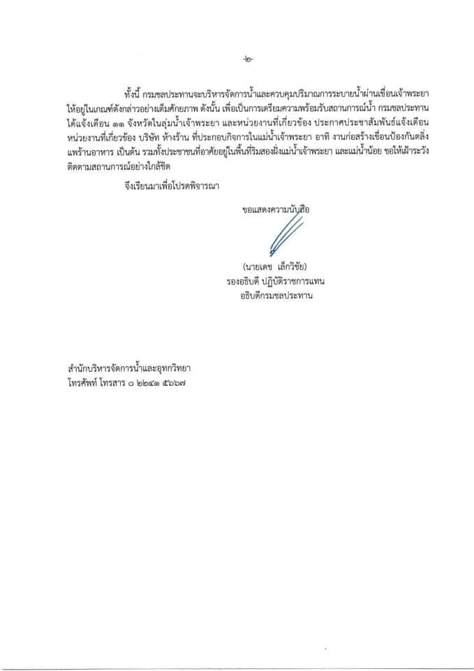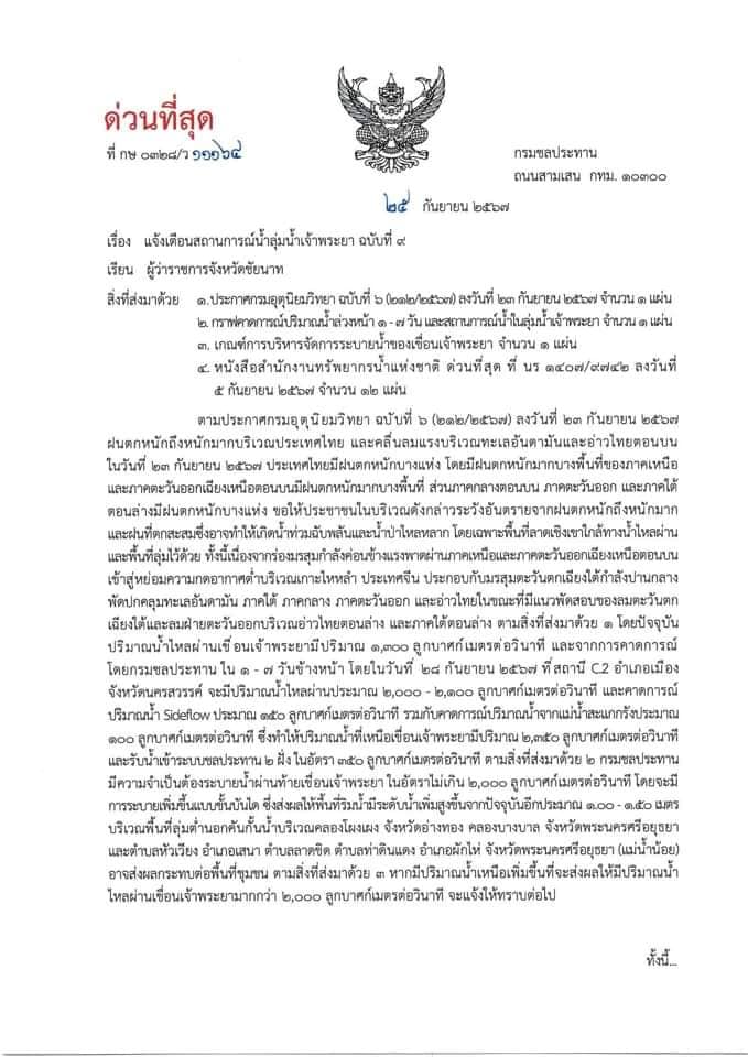 ทั้งนี้ กรมชลประทาน ออกประกาศแจ้งเตือนสถานการณ์น้ำลุ่มเจ้าพระยา 11 จังหวัด ประกอบด้วย จ.อุทัยธานี ชัยนาท สิงห์บุรี อ่างทอง พระนครศรีอยุธยา สุพรรณบุรี ลพบุรี ปทุมธานี นนทบุรี สมุทรปราการ และ กรุงเทพมหานคร เพื่อประชาสัมพันธ์แจ้งเตือนไปยังบริษัท ห้างร้าน ที่ประกอบกิจการในแม่น้ำเจ้าพระยา รวมทั้งประชาชนริมสองฝั่งแม่น้ำเจ้าพระยา ให้เฝ้าระวังและติดตามสถานการณ์อย่างใกล้ชิด หากมีแนวโน้มที่ปริมาณน้ำเพิ่มขึ้น และมีความจำเป็นต้องปรับเพิ่มการระบายน้ำผ่านเขื่อนเจ้าพระยา กรมชลประทานจะแจ้งให้ทราบต่อไป