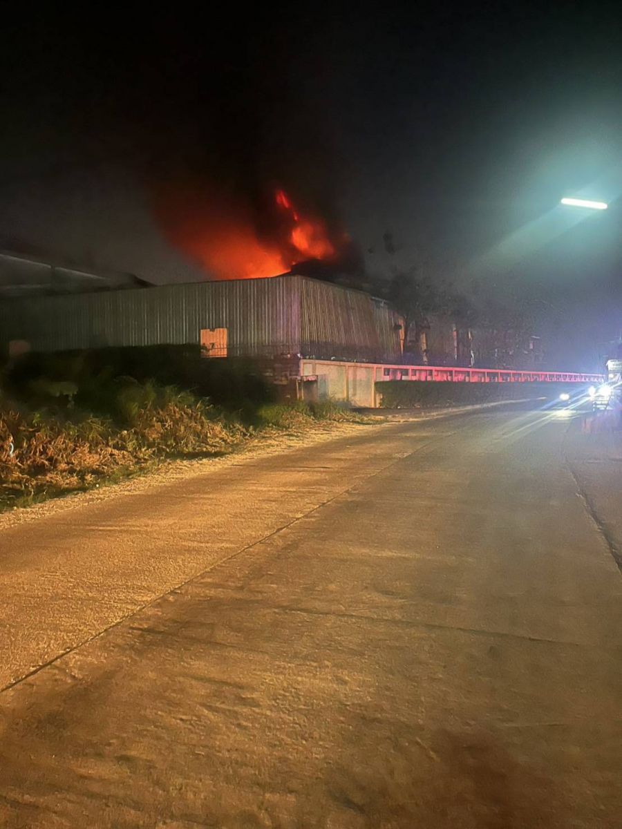 ไฟไหม้โรงงานเสื่อน้ำมัน ที่เมืองสมุทรสาคร เจ้าหน้าที่ดับเพลิงระดมฉีดน้ำ-โฟมดับวุ่น โชคดีดับทันก่อนลามทั้งอาคาร