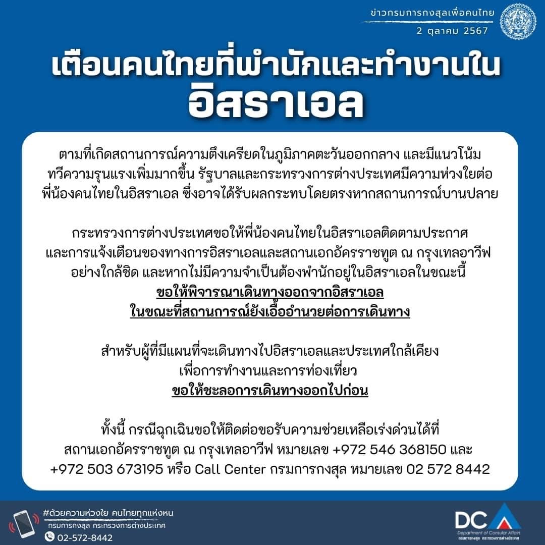 วันที่ 2 ตุลาคม 2567 กรมการกงสุล กระทรวงการต่างประเทศ ประกาศ เตือนคนไทยที่พำนักและทำงานใน อิสราเอล ตามที่เกิดสถานการณ์ความตึงเครียดในภูมิภาคตะวันออกกลาง และมีแนวโน้มทวีความรุนแรงเพิ่มมากขึ้น รัฐบาลและกระทรวงการต่างประเทศมีความห่วงใยต่อพี่น้องคนไทยในอิสราเอล ซึ่งอาจได้รับผลกระทบโดยตรงหากสถานการณ์บานปลาย