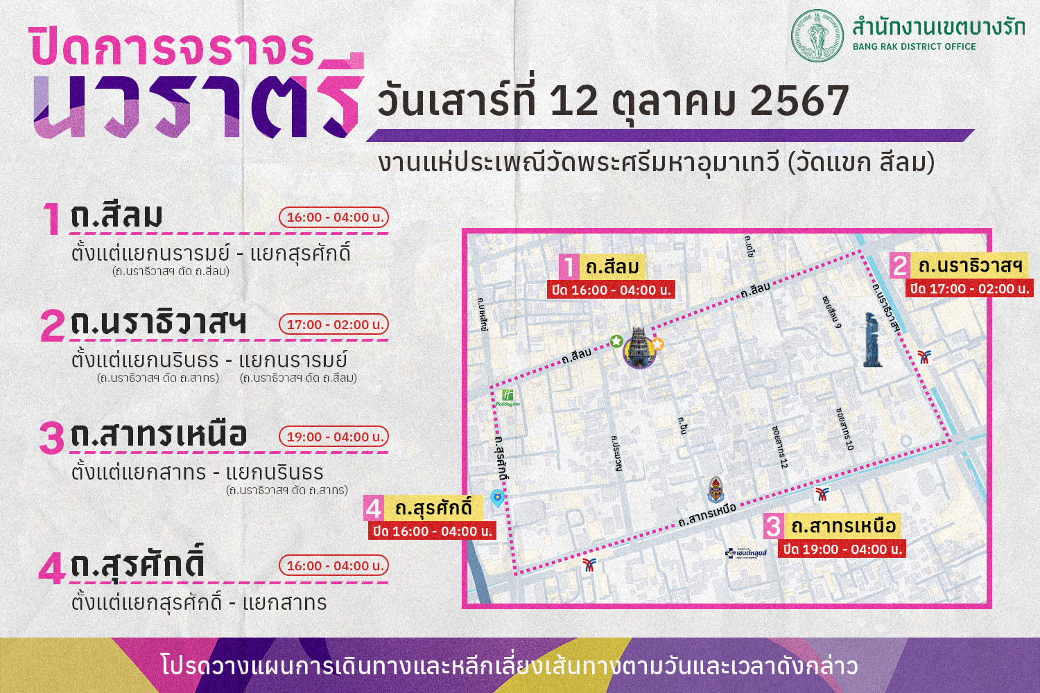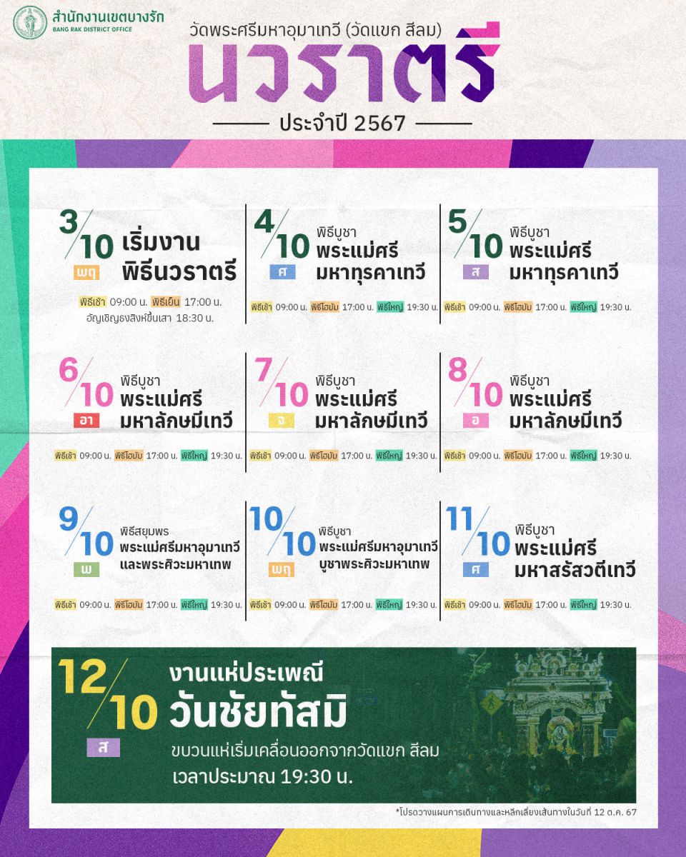 ด้านสำนักงานเขตบางรัก รายงานด้วยว่า สำหรับงานแห่ประเพณีวันวิชัยทัสมิ วัดพระศรีมหาอุมาเทวี (วัดแขก สีลม) ประจำปี 2567 นับเป็นหนึ่งงานใหญ่ประจำปีในพื้นที่บางรัก กับ 'พิธีนวราตรีและงานแห่ประเพณี วัดแขก สีลม' โดยขบวนแห่ประเพณีปีนี้ ซึ่งเป็นไฮไลท์ของงาน จะมีขึ้นในวันเสาร์ที่ 12 ตุลาคมนี้ ตั้งแต่เวลา 19.30 น. เป็นต้นไป แจ้งข่าวไปยังปชช.ผู้ใช้เส้นทางทราบโปรดหลีกเลี่ยงเส้นทาง ถ.สีลม, ถ.นราธิวาสราชนครินทร์, ถ.สาทรเหนือ และ ถ.สุรศักดิ์ ในวันและช่วงเวลาดังกล่าว