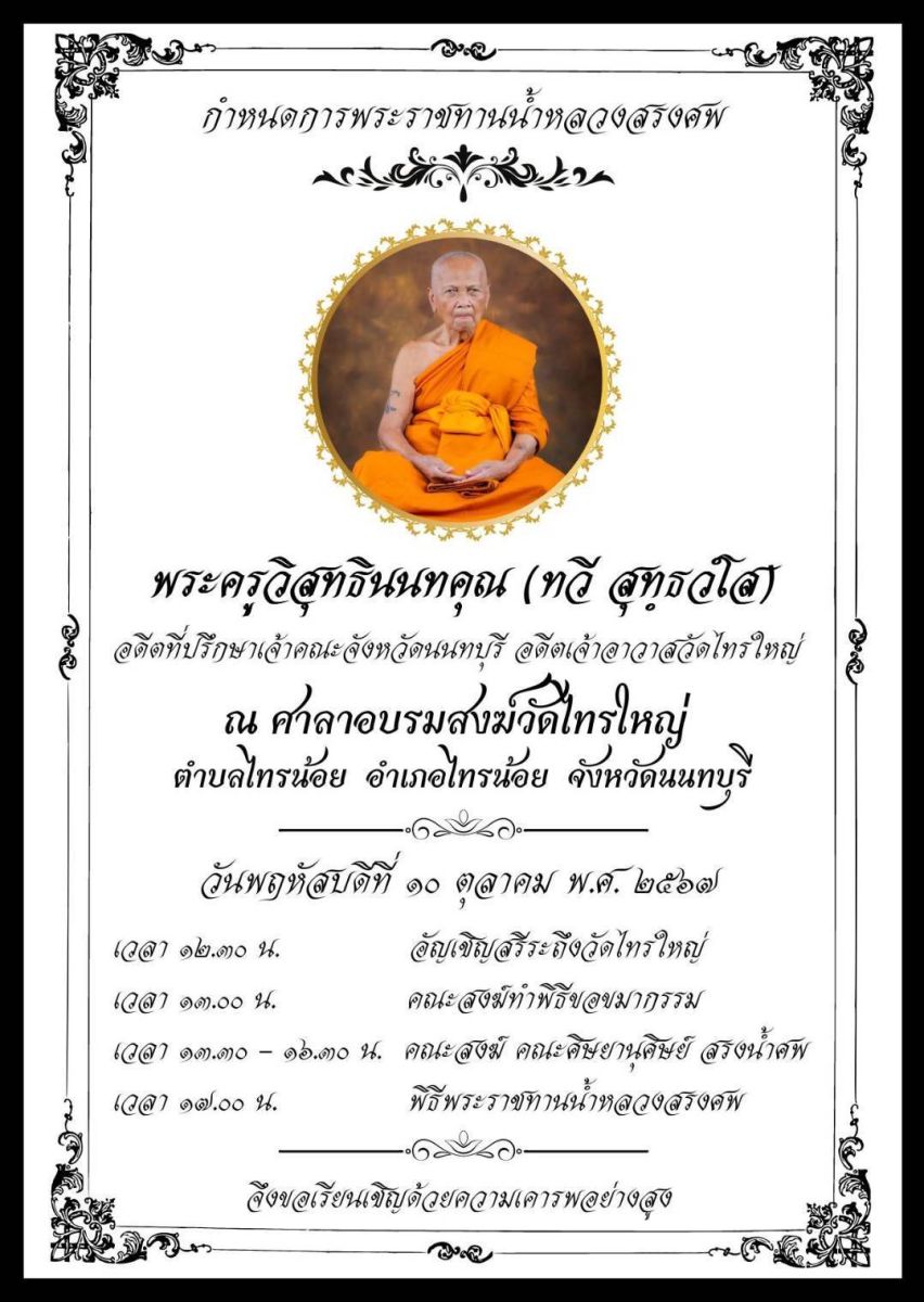 เมื่อเวลา 14.00 น. วันที่ 9 ต.ค.67 ผู้สื่อข่าวได้รับแจ้งว่า พระครูวิสุทธินนทคุณ หรือ หลวงปู่ทวี สุทธวังโส อายุ 86 ปี เจ้าอาวาสวัดไทรใหญ่ ต.ไทรน้อย จ.นนทบุรี อดีตที่ปรึกษาเจ้าคณะจังหวัดนนทบุรี ได้มรณภาพลงอย่างสงบที่โรงพยาบาลพระนั่งเกล้า จากโรคประจำตัว เมื่อเวลา 08.47 น.วันที่ 9 ตุลาคม 67 หลังจากเข้ารักษาตัวที่ตั้งแต่วันที่ 24 กันยายน 67 ที่ผ่านมา โดยทางวัดไทรใหญ่ มีกำหนดอัญเชิญสรีระสังขารพระครูวิสุทธินนทคุณ มาประกอบพิธีทางศาสนาและพิธีพระราชทานน้ำหลวงอาบศพ ที่ศาลาอบรมสงฆ์วัดไทรใหญ่ ต.ไทรน้อย อ.ไทรน้อย จ.นนทบุรี ในวันที่ 10 ตุลาคมตั้งแต่เวลา 12.00 -17.00 น.