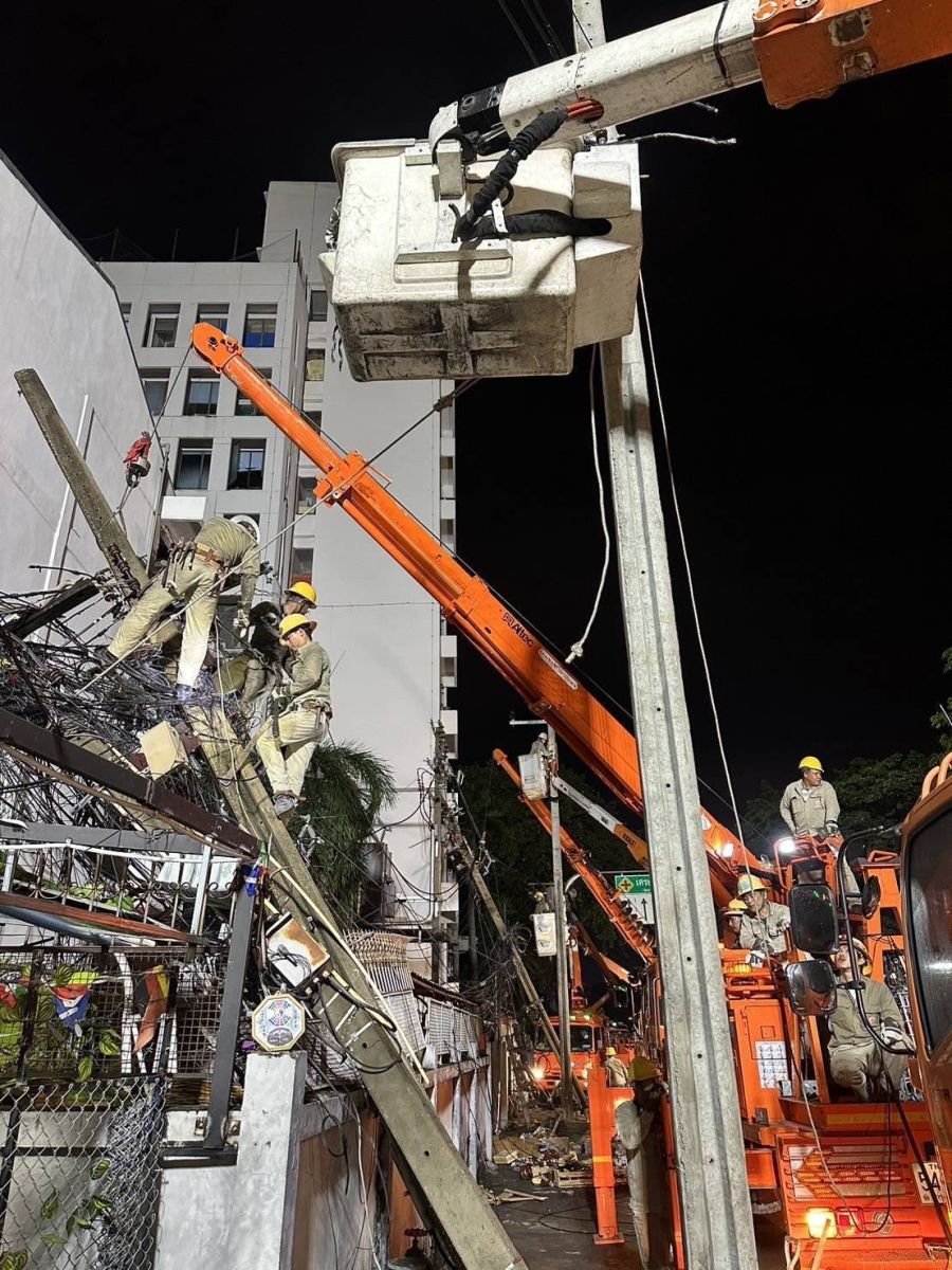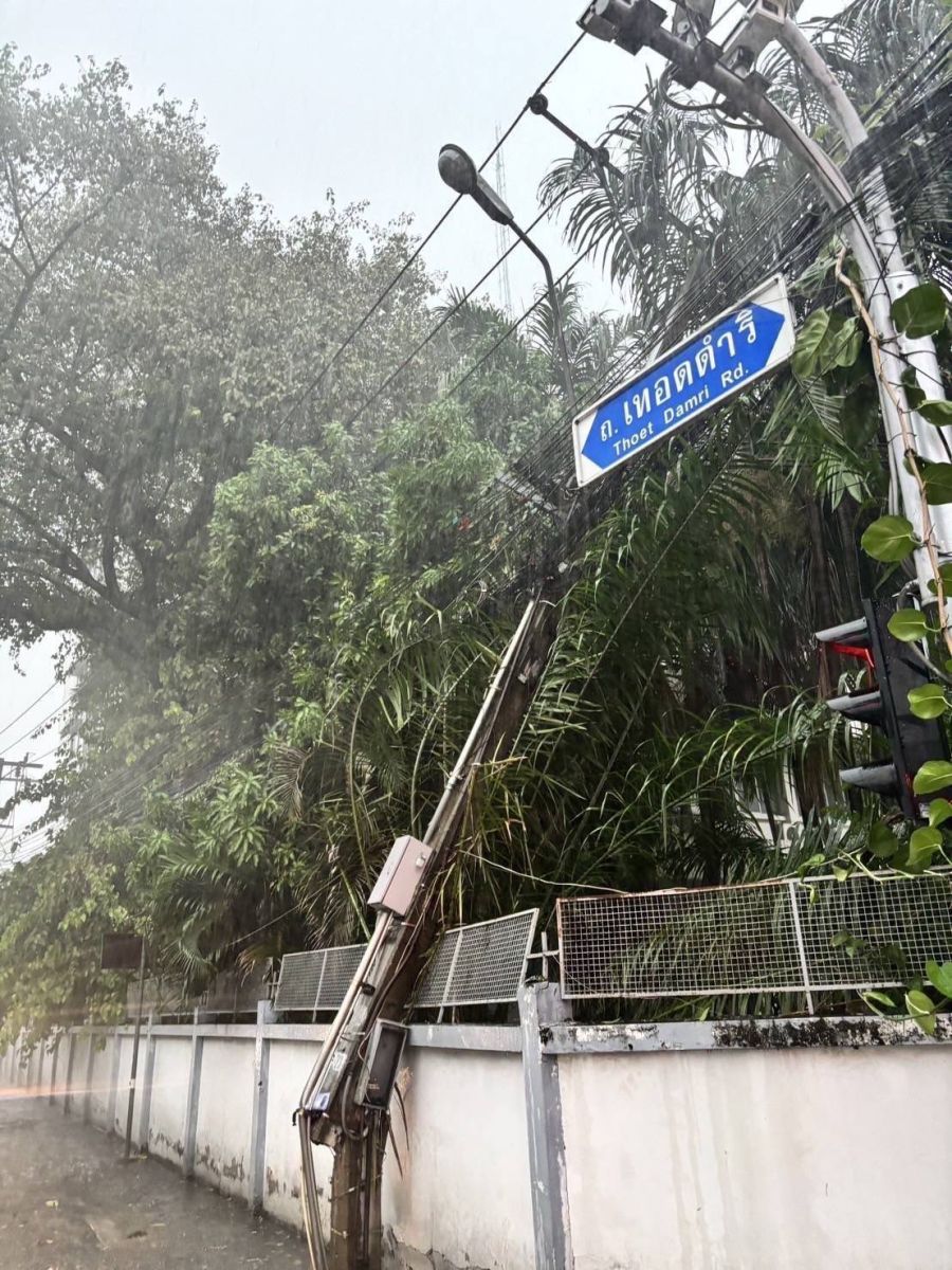 การไฟฟ้านครหลวง MEA ลงพื้นที่แก้ไขเหตุต้นไม้ล้มเหนี่ยวรั้งสายไฟทำให้เสาไฟฟ้าล้ม
