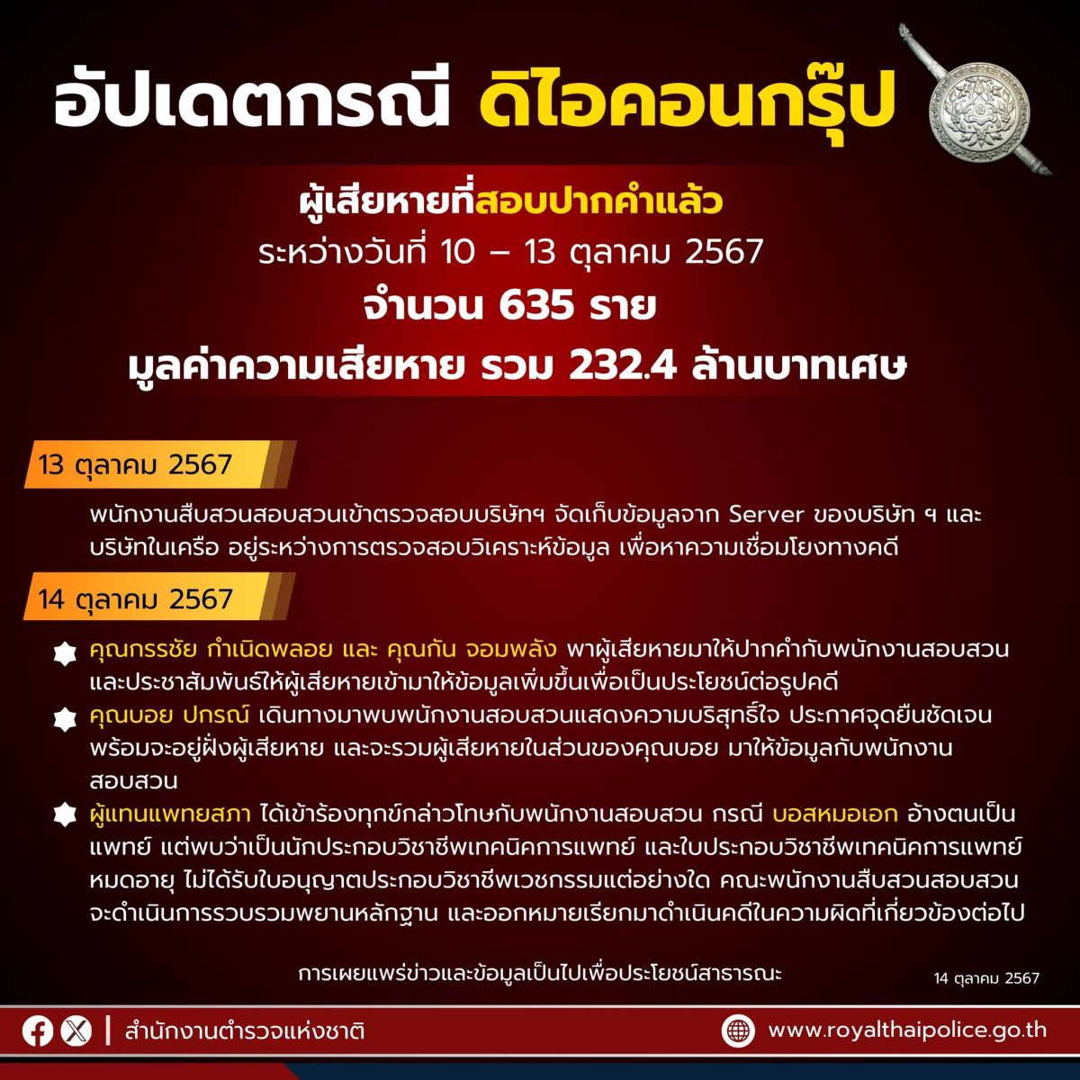 รวมยอดผู้เสียหายที่สอบปากคำแล้ว ระหว่างวันที่ 10 – 13 ตุลาคม 2567 จำนวน 635 ราย มูลค่าความเสียหายรวม 232.4 ล้านบาทเศษ