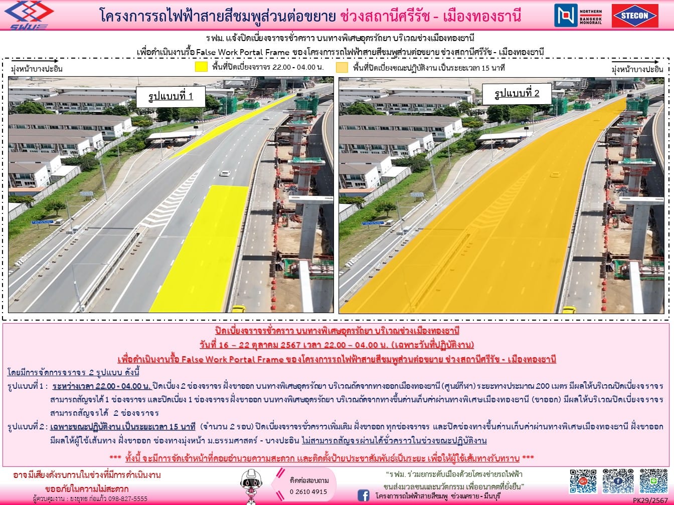 การรถไฟฟ้าขนส่งมวลชนแห่งประเทศไทย (รฟม.) แจ้งว่า บริษัท ซิโน-ไทย เอ็นจีเนียริ่ง แอนด์ คอนสตรัคชั่น จำกัด (มหาชน) ผู้รับจ้างก่อสร้างงานโยธา ของโครงการรถไฟฟ้าสายสีชมพูส่วนต่อขยาย ช่วงสถานีศรีรัช – เมืองทองธานี มีความจำเป็นต้องปิดเบี่ยงจราจรชั่วคราว บนทางพิเศษอุดรรัถยา บริเวณช่วงเมืองทองธานี ของโครงการรถไฟฟ้าสายสีชมพูส่วนต่อขยาย ช่วงสถานีศรีรัช – เมืองทองธานี โดยมีการจัดจราจร 2 รูปแบบดังนี้