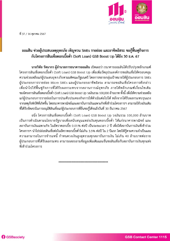 อนึ่ง โครงการสินเชื่อดอกเบี้ยต่ำ (Soft Loan) GSB Boost Up วงเงินรวม 100,000 ล้านบาท เป็นการดำเนินตามนโยบายรัฐบาลเพื่อสนับสนุนแหล่งเงินทุนดอกเบี้ยต่ำ ให้แก่ธนาคารพาณิชย์ และสถาบันการเงินเฉพาะกิจ ในอัตราดอกเบี้ย 0.01% ต่อปี เป็นระยะเวลา 2 ปี เพื่อให้สถาบันการเงินที่เข้าร่วมโครงการฯ นำไปปล่อยสินเชื่อต่อในอัตราดอกเบี้ยต่ำไม่เกิน 3.5% ต่อปี ใน 2 ปีแรก โดยให้กู้ตามความจำเป็นและความสามารถในการชำระหนี้ กำหนดวงเงินสูงสุดรวมทุกสถาบันการเงิน ไม่เกิน 40 ล้านบาทต่อราย ผู้ประกอบการที่ได้รับผลกระทบ สามารถสอบถามข้อมูลเพิ่มเติมและยื่นขอสินเชื่อกับสถาบันการเงินทุกแห่งที่เข้าร่วมโครงการ