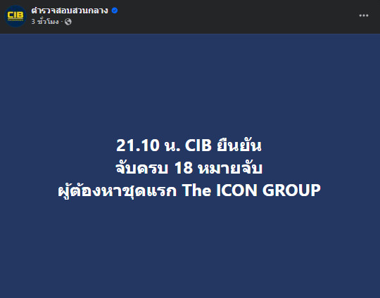 เวลา 21.10 น. วันที่ 16 ตุลาคม 2567 ผู้สื่อข่าวรายงานว่า เพจเฟซบุ๊ก ตำรวจสอบสวนกลาง CIB ยืนยัน จับครบ 18 หมายจับ ผู้ต้องหาชุดแรก The ICON GROUP