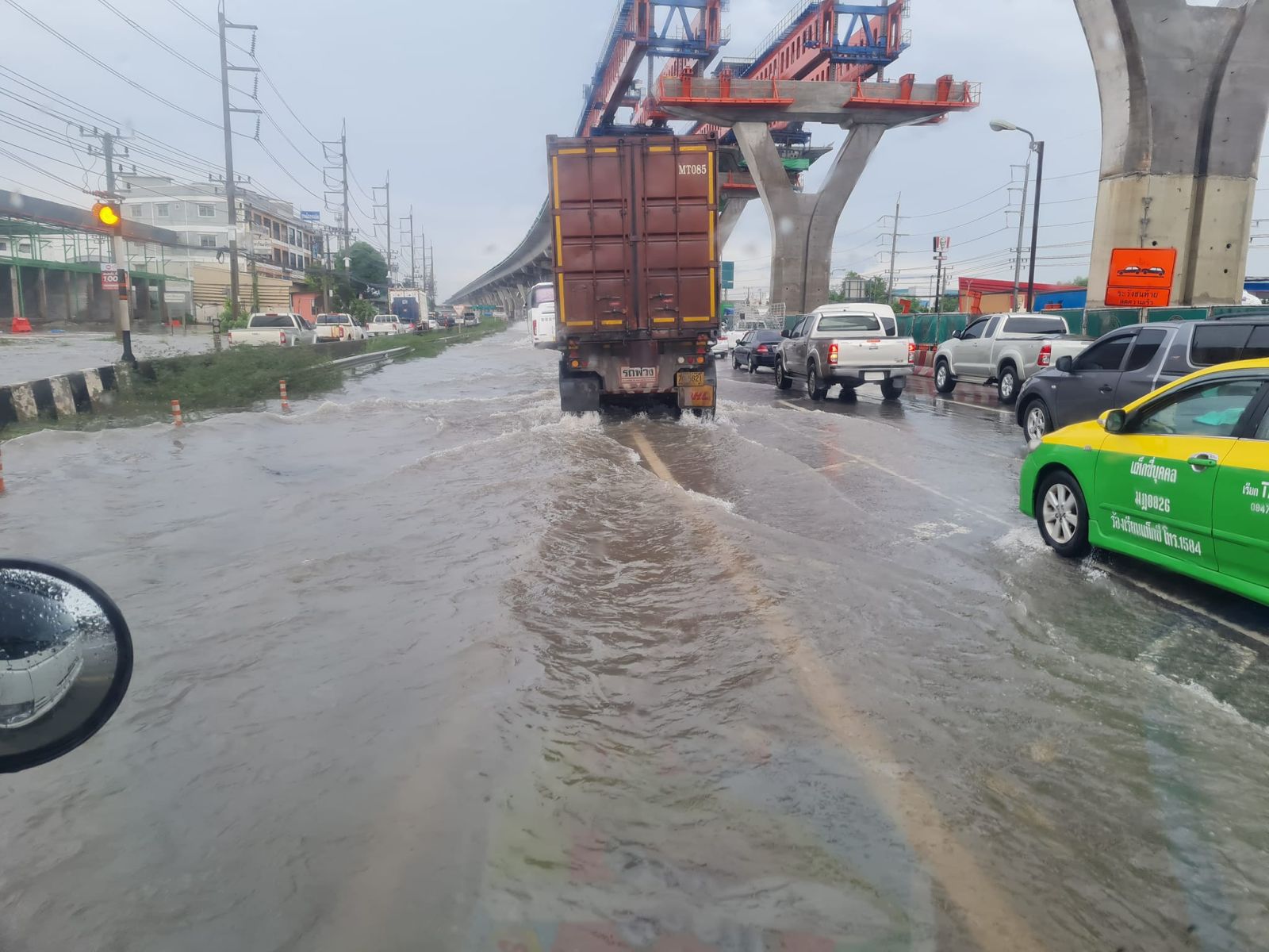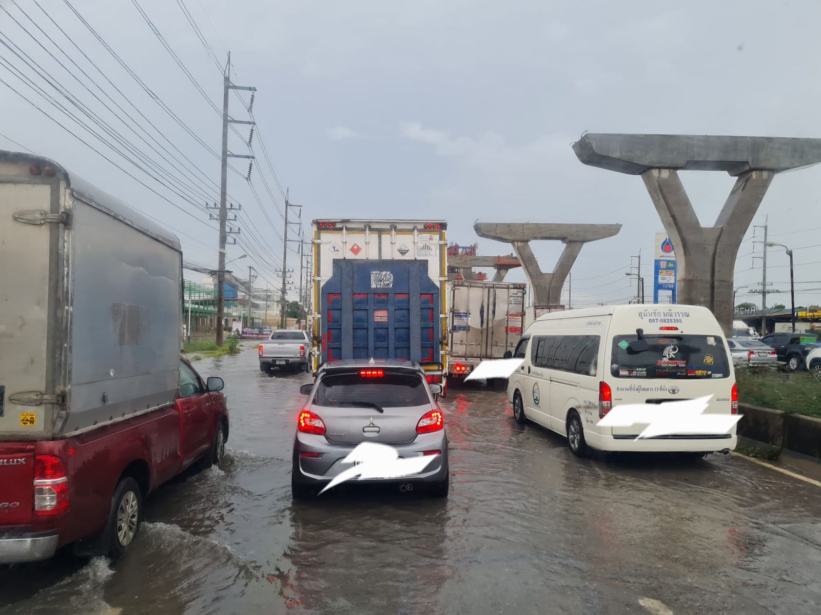 ถนนพระราม 2 ขาออก มีน้ำท่วมขังหลายจุด 'หัวแถว' อยู่ตรงสะพานข้ามคลองตาขำ (โรงเรียนสารสาสน์วิเทศสมุทรสาคร) 'ท้ายแถว' สะสมอยู่ที่ทางลงสะพานข้ามแม่น้ำท่าจีน ราวๆ 8 กม.