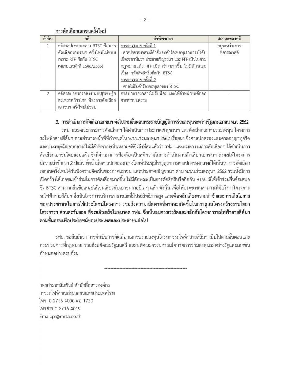 3. คดีศาลอาญาทุจริตและประพฤติ มิชอบกลาง BTSC ฟ้องการแก้ RFP และยกเลิกการคัดเลือกฯ โดยทุจริต(หมายเลขแดงที่ อท.133/2565) ศาลอาญาฯ พิพากษายกฟ้อง โดยเห็นว่า การแก้ไข RFP เป็นไปเพื่อประโยชน์ของรัฐ ไม่เป็นการเอื้อประโยชน์ให้แก่ผู้ยื่นข้อเสนอรายใด และการยกเลิกการคัดเลือกฯ ไม่มีเจตนากลั่นแกล้ง BTSC หรือกระทำนอกขอบเขตของกฎหมาย ไม่ได้ปฏิบัติหน้าที่หรือละเว้นการปฏิบัติหน้าที่โดยทุจริต อยู่ระหว่าง BTSC ขอขยายระยะเวลาอุทธรณ์คำพิพากษาการคัดเลือกเอกชนครั้งใหม่
