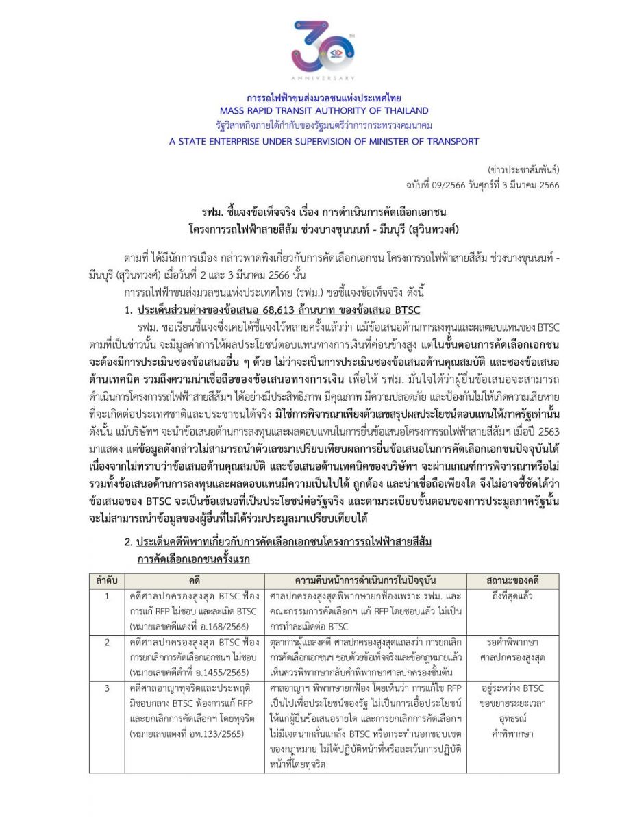 ตามที่ ได้มีนักการเมือง กล่าวพาดพิงเกี่ยวกับการคัดเลือกเอกชน โครงการรถไฟฟ้าสายสีส้ม ช่วงบางขุนนนท์ - มีนบุรี (สุวินทวงศ์) เมื่อวันที่ 2 และ 3 มีนาคม 2566 นั้น