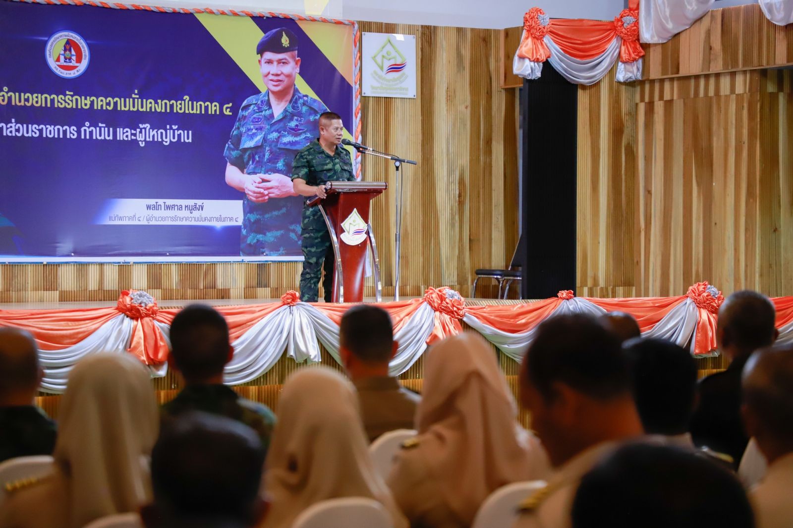 โดย พลโท ไพศาล หนูสังข์ แม่ทัพภาคที่ 4 / ผู้อำนวยการรักษาความมั่นคงภายในภาค 4 ย้ำว่า ผู้นำท้องที่ ท้องถิ่น กำนัน ผู้ใหญ่บ้าน ถือเป็นกำลังสำคัญและเป็นหัวใจหลักในการขับเคลื่อนสร้างการรับรู้ สร้างความเข้าใจแก่พี่น้องประชาชนในพื้นที่ เพื่อร่วมกันดูแลปกป้องประชาชน ให้มีความปลอดภัยในชีวิตและทรัพย์สิน รวมทั้งยกระดับคุณภาพชีวิตให้ดียิ่งขึ้น ภายใต้นโยบายสำคัญเร่งด่วน คือการควบคุมพื้นที่และการบังคับใช้กฎหมาย งานแก้ไขปัญหายาเสพติด งานส่งเสริมการอยู่ร่วมกันภายใต้สังคมภาคพหุวัฒนธรรมที่เข้มแข็ง สร้างความเข้าใจและบูรณาการด้านความมั่นคงและด้านการพัฒนาให้เกิดความสันติสุขอย่างยั่งยืน โดยใช้สภาสันติสุขตำบลเข้ามามีส่วนร่วมในการแก้ไขปัญหา ส่งเสริมบทบาทแก่ผู้นำชุมชนแสดงศักยภาพผ่านสื่อต่าง ๆ ช่วยเป็นหูเป็นตา รู้ความเคลื่อนไหวของคนในหมู่บ้าน ดูแลพื้นที่ปฏิบัติภารกิจเชิงรับ และสนับสนุนภารกิจเชิงรุก โดยประสานการปฏิบัติกับหน่วยกำลังในพื้นที่อย่างต่อเนื่อง ทั้งนี้เพื่อให้พื้นที่มีความปลอดภัยปราศจากเหตุการณ์ความรุนแรงและอยู่ร่วมกันได้ในสังคมพหุวัฒนธรรม ที่จะต้องใช้ความร่วมมือจากทุกท่าน เสริมสร้างความเข้มแข็งให้ชุมชนที่เป็นรากฐานสำคัญของการพัฒนาประเทศ และเชื่อว่าการพัฒนาที่ตอบสนองต่อบริบทของท้องถิ่นจะนำไปสู่การแก้ปัญหาได้อย่างถูกวิธี สามารถสร้างความสุขให้กับคนในชุมชนได้อย่างแท้จริง