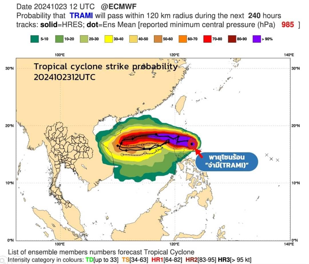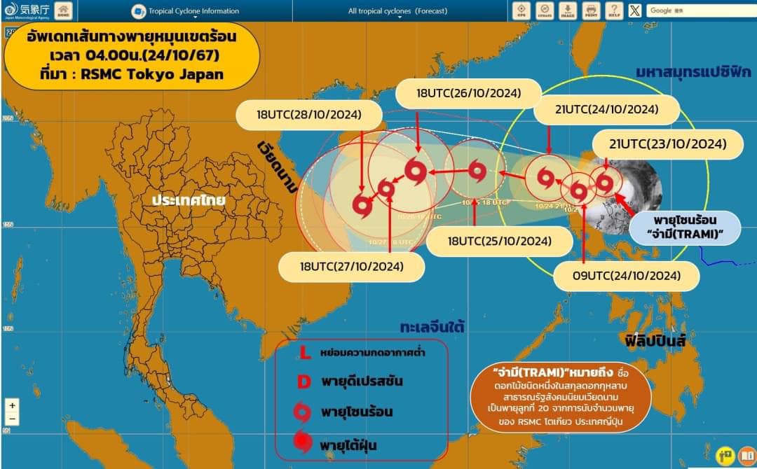 พายุโซนร้อน "จ่ามี (TRAMI)" เช้านี้มีศูนย์กลางอยู่บริเวณเกาะลูซอล ประเทศฟิลิปปินส์ กำลังเคลื่อนตัวทางตะวันตก คาดว่าจะเคลื่อนตัวผ่านเกาะลูซอล ประเทศฟิลิปปินส์ ในช่วงวันนี้ (24 ต.ค.67) และลงสู่ทะเลจีนใต้ตอนบน จากนั้นเคลื่อนไปทางตะวันตก เข้าใกล้ทางตอนใต้เกาะไหหลำ และชายฝั่งตอนกลางของประเทศเวียดนามในช่วงวันที่ 26 -27 ต.ค.67 ก่อนที่จะวนกลับไปในทะเลจีนใต้อีกครั้ง พายุนี้จะไม่ส่งผลกระทบโดยตรงกับประเทศไทย แต่อาจจะทำให้ประเทศไทย มีเมฆเพิ่มขึ้น และมีฝนบางพื้นที่ กับมีลมแรง เป็นลมตะวันตกที่พัดเข้าหาพายุ โดยเฉพาะทางตะวันออกของภาคอีสาน (จ.อุบล อำนาจเจริญ มุกดาหาร ยโสธร) เนื่องจากช่วงเวลาดังกล่าวจะมีมวลอากาศเย็นแผ่ลงมาปกคลุมอยู่ด้านหน้าของพายุ พายุนี้จะไม่เคลื่อนเข้าสู่ประเทศไทย แต่ยังต้องติดตามเนื่องจากทิศทางยังมีการเปลี่ยนแปลง ตลอด เตือนผู้ที่จะเดินทางไปประเทศฟิลิปปินส์ ควรตรวจสอบสภาพอากาศก่อนออกเดินทาง ข้อมูลอาจจะมีการเปลี่ยนแปลงได้ ส่วนทะเลอันดามัน พายุดีเปรสชันได้ทวีกำลังแรงขึ้นเป็นพายุไซโคลน "DANA" กำลังเคลื่อนตัวทางตะวันตกเฉียงเหนือ ไปทางประเทศอินเดียหรือบังคลาเทศ ไม่มีผลกระทบกับประเทศไทย