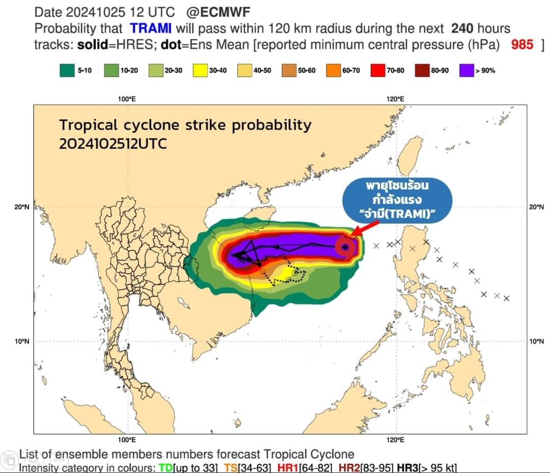 กรมอุตุนิยมวิทยา อัปเดต สถานการณ์พายุ เวลา 04.00น. วันที่ 26 ตุลาคม 2567 พายุโซนร้อนกำลังแรง "จ่ามี(TRAMI)"บริเวณทะเลจีนใต้ตอนบน กำลังเคลื่อนตัวทางตะวันตกเข้าใกล้ทางตอนใต้ของเกาะไหลหลำ ประเทศจีน และพายุนี้จะเข้าเคลื่อนเข้าสู่ชายฝั่งทางด้านตอนกลาง(ใกล้บริเวณเมืองดานัง)ของประเทศเวียดนาม พายุนี้จะไม่เคลื่อนเข้าสู่ประเทศไทย เนื่องจากยังมีมวลอากาศเย็นแผ่ลงมาปกคลุมทางด้านหน้าของพายุ ในช่วง 26 - 28 ต.ค.67
