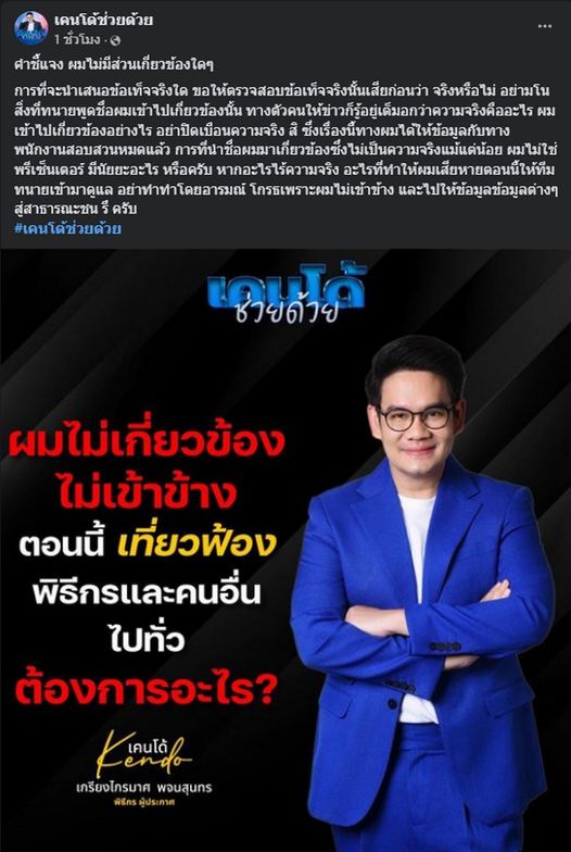 ขณะที่ต่อมา ดีเจเคนโด้ พิธีกรและผู้ประกาศชื่อดัง โพสต์ข้อความชี้แจงผ่านทางเพจ เคนโด้ช่วยด้วย ความว่า คำชี้แจง ผมไม่มีส่วนเกี่ยวข้องใดๆ การที่จะนำเสนอข้อเท็จจริงใด ขอให้ตรวจสอบข้อเท็จจริงนั้นเสียก่อนว่า จริงหรือไม่ อย่ามโน สิ่งที่ทนายพูดชื่อผมเข้าไปเกี่ยวข้องนั้น ทางตัวคนให้ข่าวก็รู้อยู่เต็มอกว่าความจริงคืออะไร ผมเข้าไปเกี่ยวข้องอย่างไร อย่าบิดเบือนความจริง