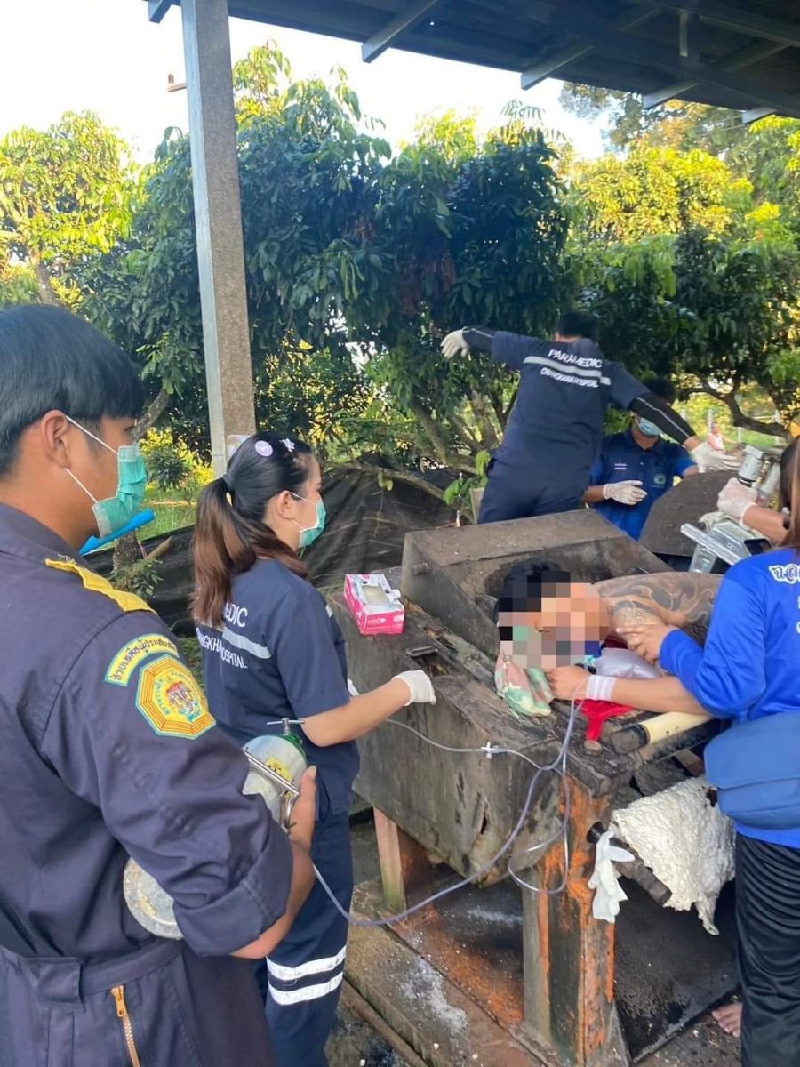 ที่เกิดเหตุ เบื้องต้นในที่เกิดเหตุพบ ผู้บาดเจ็บชาย 1 ราย อายุ 22 ปี แขนข้างขวาติดอยู่กับเครื่องเครปยาง เจ้าหน้าที่อาสาสมัครฯ ดำเนินการใช้อุปกรณ์ตัดถ่าง ทำงานงัดเครื่องเพื่อนำแขนผู้บาดเจ็บออกมา แขนมีลักษณะเกือบขาด ปฐมพยาบาลเบื้องต้นที่เกิดเหตุ และมอบให้รถกู้ชีพนำส่ง รพ.ใกล้เคียง