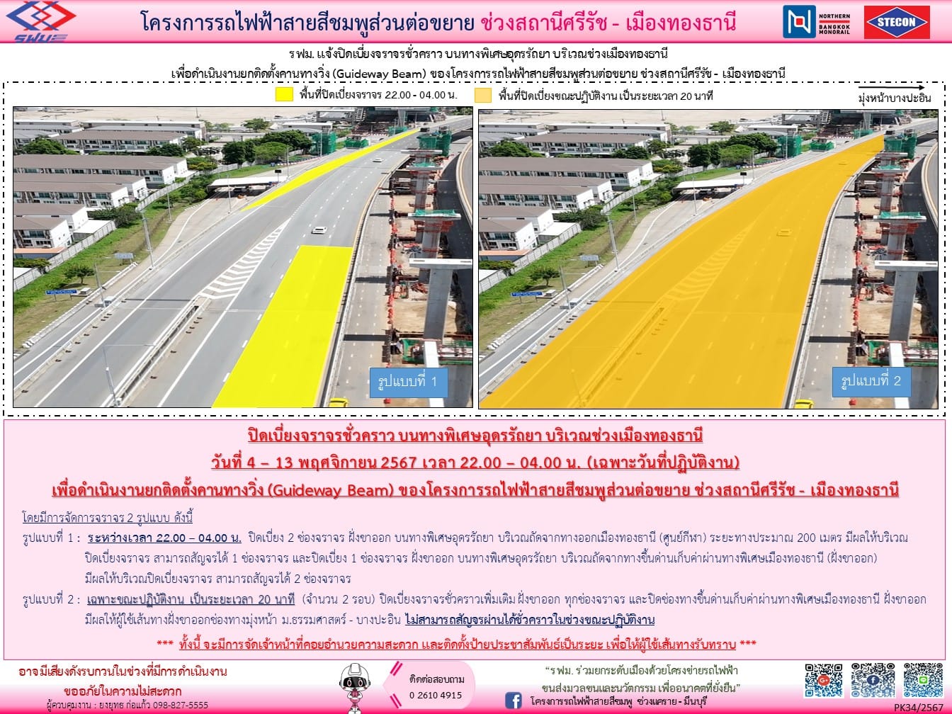 รฟม. แจ้งปิดเบี่ยงจราจรชั่วคราว บนทางพิเศษอุดรรัถยา บริเวณช่วงเมืองทองธานี วันที่ 4 – 13 พฤศจิกายน 2567 เวลา 22.00 – 04.00 น. (เฉพาะวันที่ปฏิบัติงาน) เพื่อดำเนินงานยกติดตั้งคานทางวิ่ง (Guideway Beam) ของโครงการรถไฟฟ้าสายสีชมพูส่วนต่อขยาย ช่วงสถานีศรีรัช – เมืองทองธานี การรถไฟฟ้าขนส่งมวลชนแห่งประเทศไทย (รฟม.) แจ้งว่า บริษัท ซิโน-ไทย เอ็นจีเนียริ่ง แอนด์